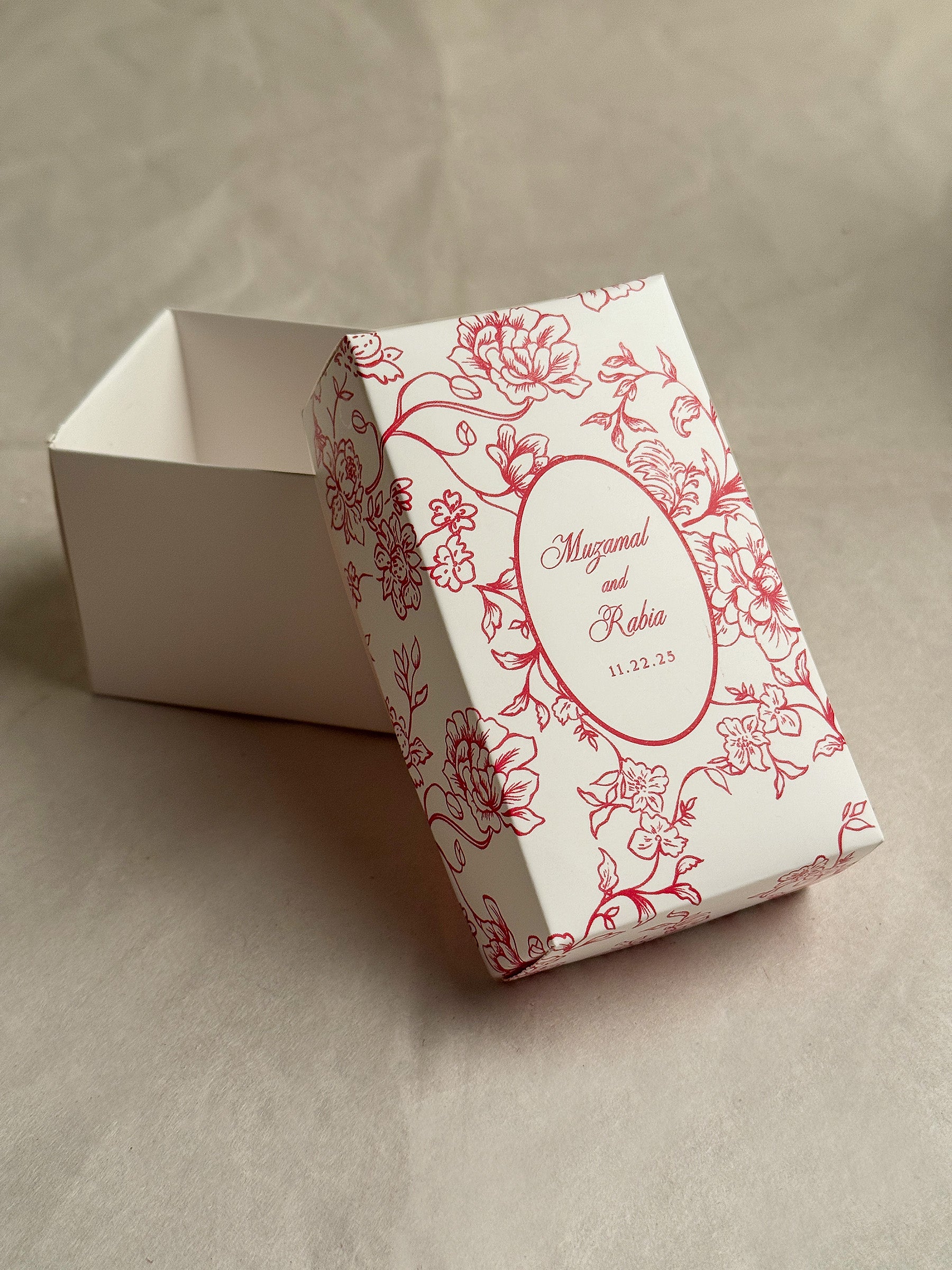 Featuring an all-over floral print inspired by classic victorian artwork, this box is elegantly crafted from ash white, laminated bleach card with an option to add a beautiful chiffon ribbon. It is an excellent choice for giving sweet treats to commemorate your Nikkah/Wedding.