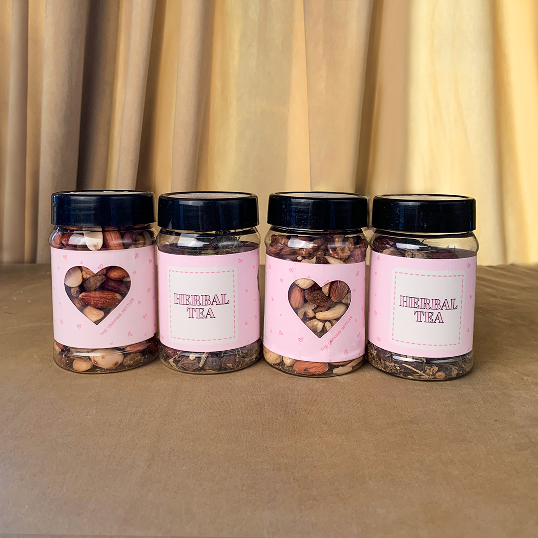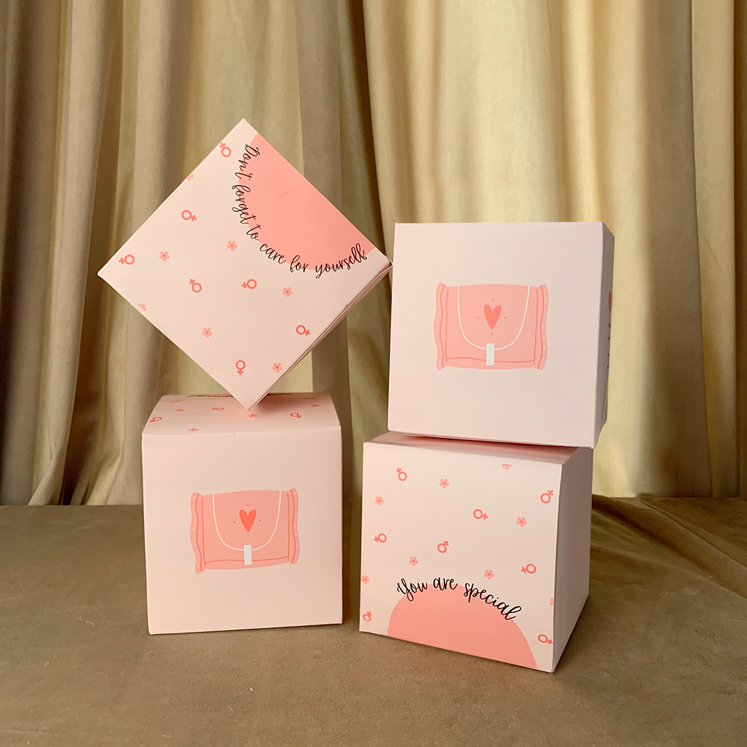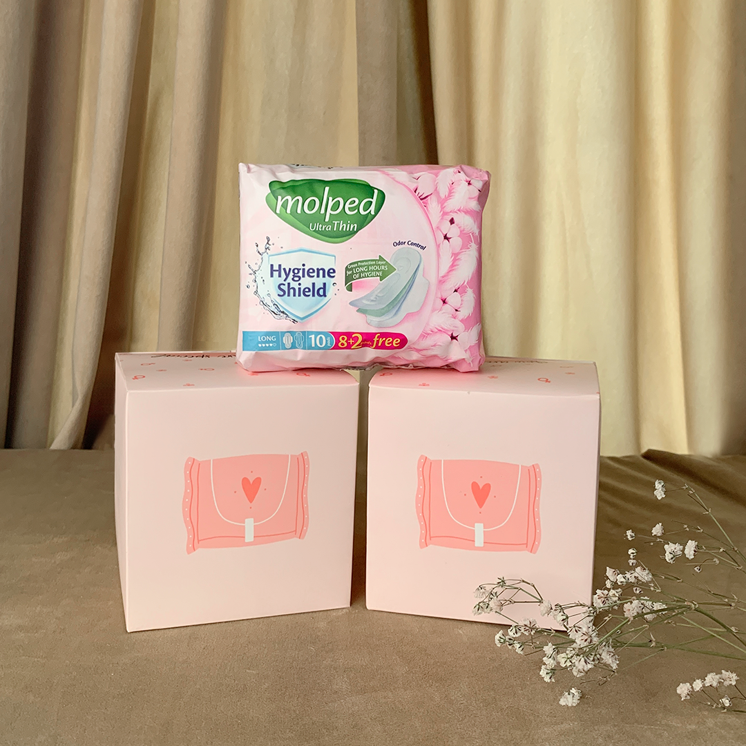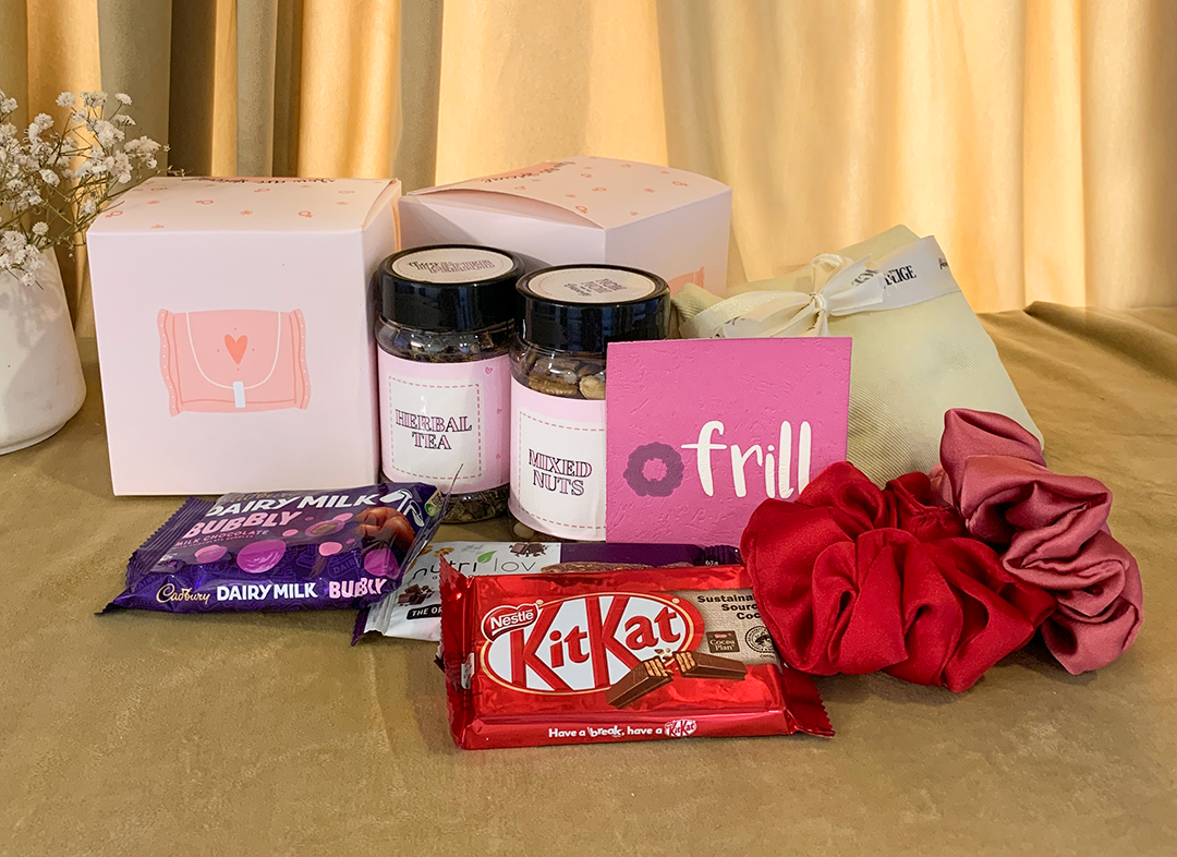 Featuring 2 packs of Molped Sanitary Pads, a jar of Herbal Tea, a jar of Mixed Nuts, 2 O Frill Scrunchies, a cozy microwaveable heating pad (made in-house with grains, cloves and essential oils to ease cramp pain) and a handful of chocolates (for those pesky cravings!).