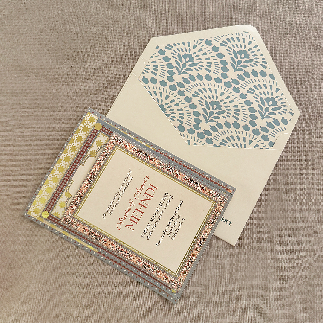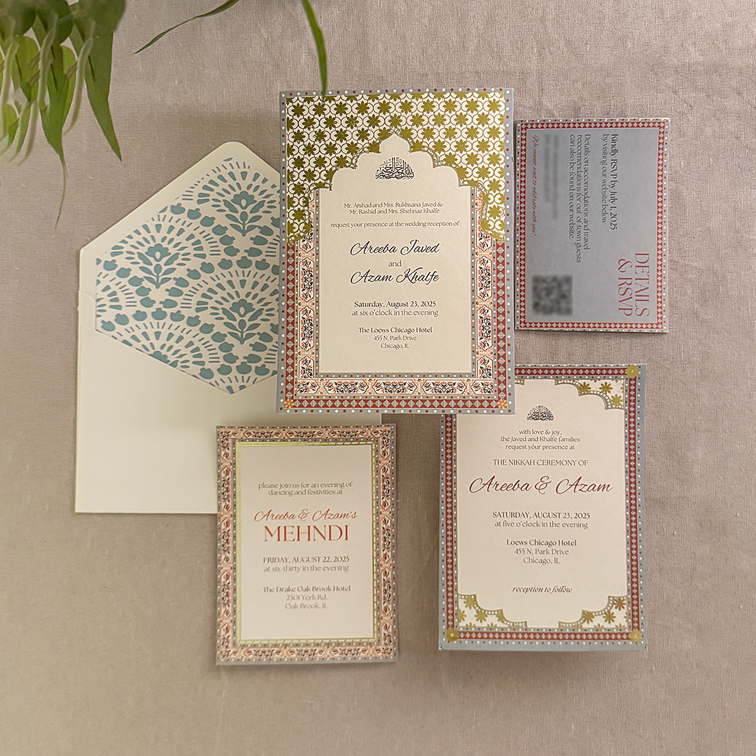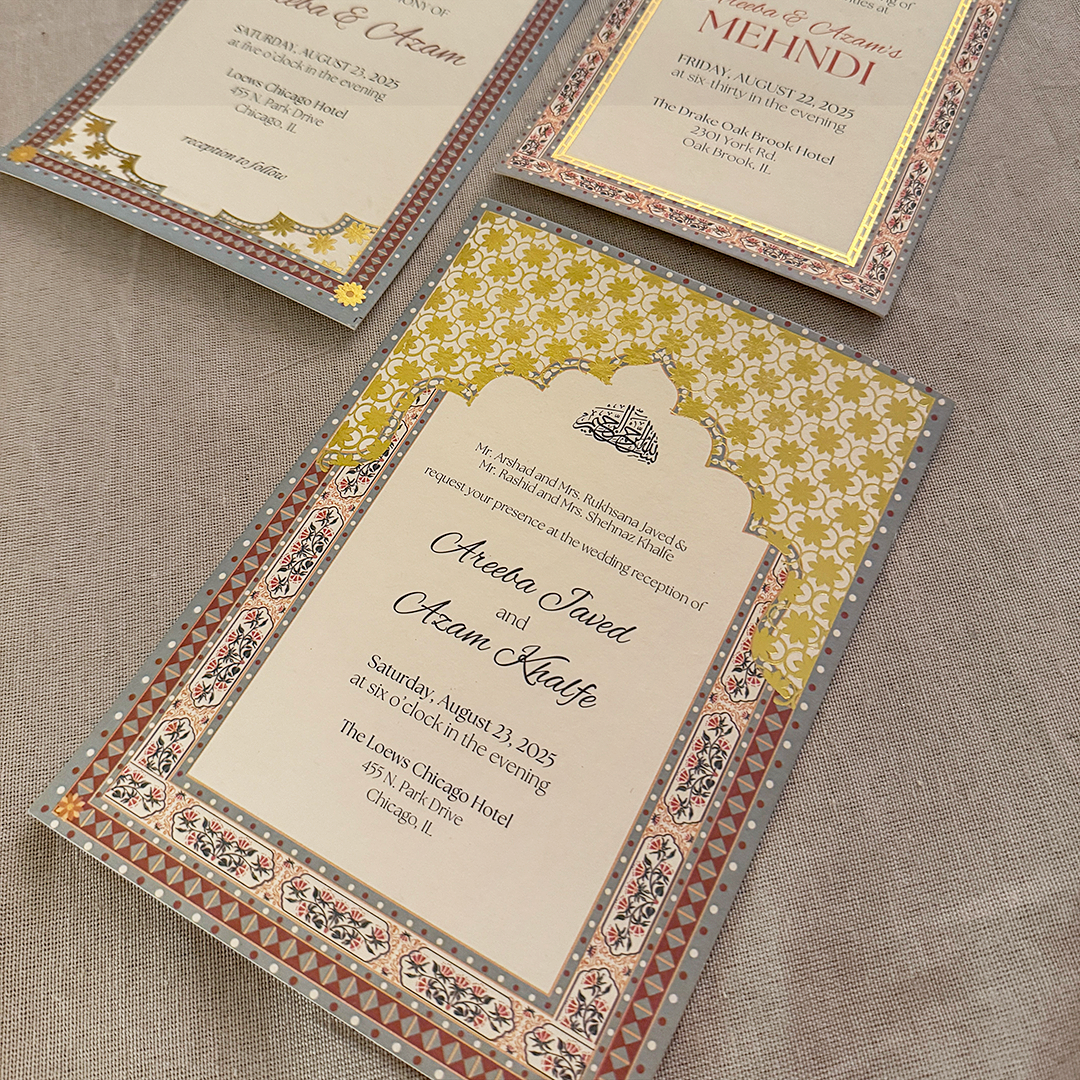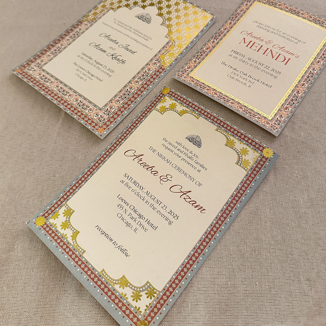 Aangan is printed on 5x7” off-white stock. This invitation set includes up to four inserts. The main card features a gold-foil arch, while the following inserts gradually step down in size. The second and third inserts carry printed event details with a gold foil detailing on the corners, and the smallest insert includes RSVP information.