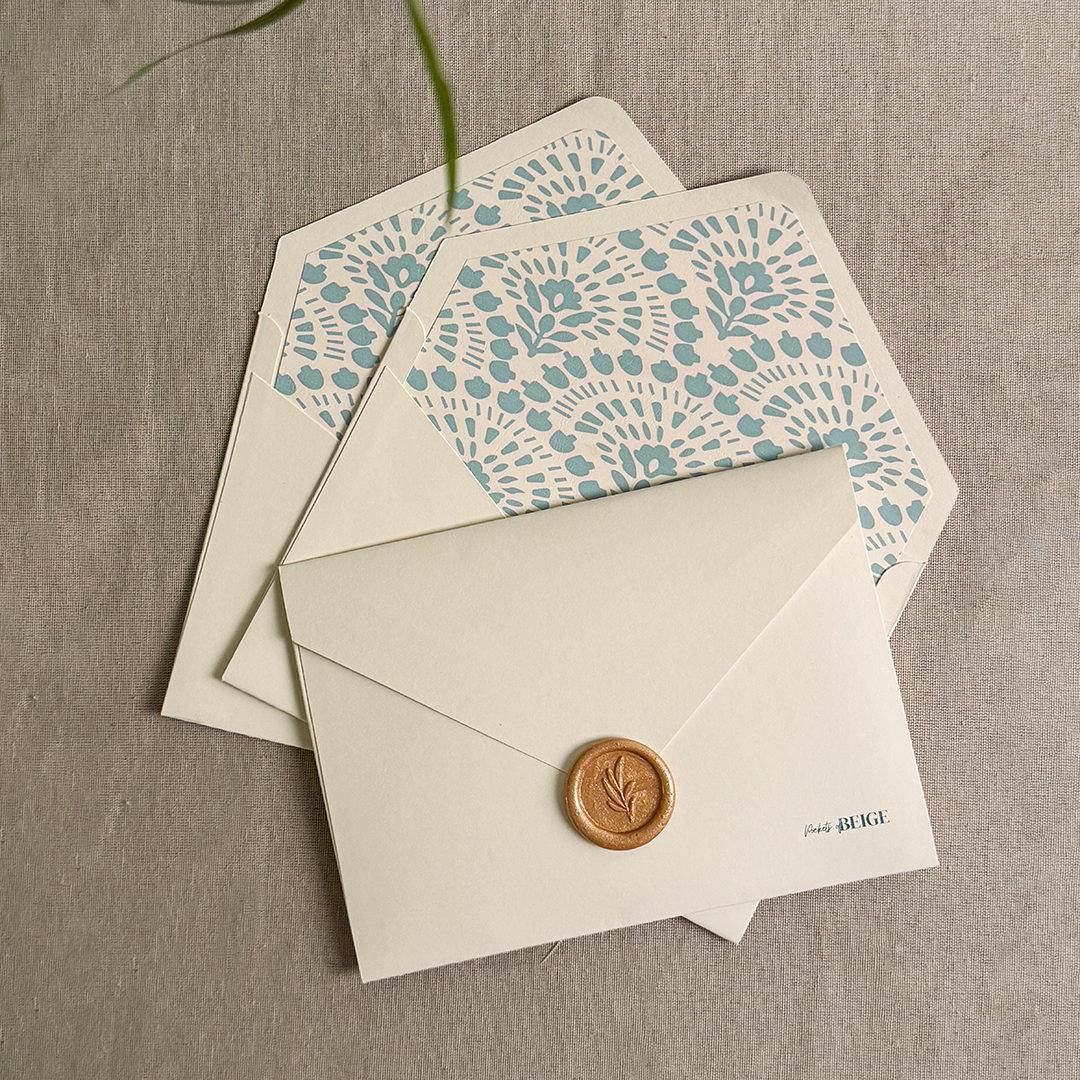 The envelope is plain off-white from the outside and opens to reveal a blue mosaic tile design on the inner liner, adding a touch of colour.
