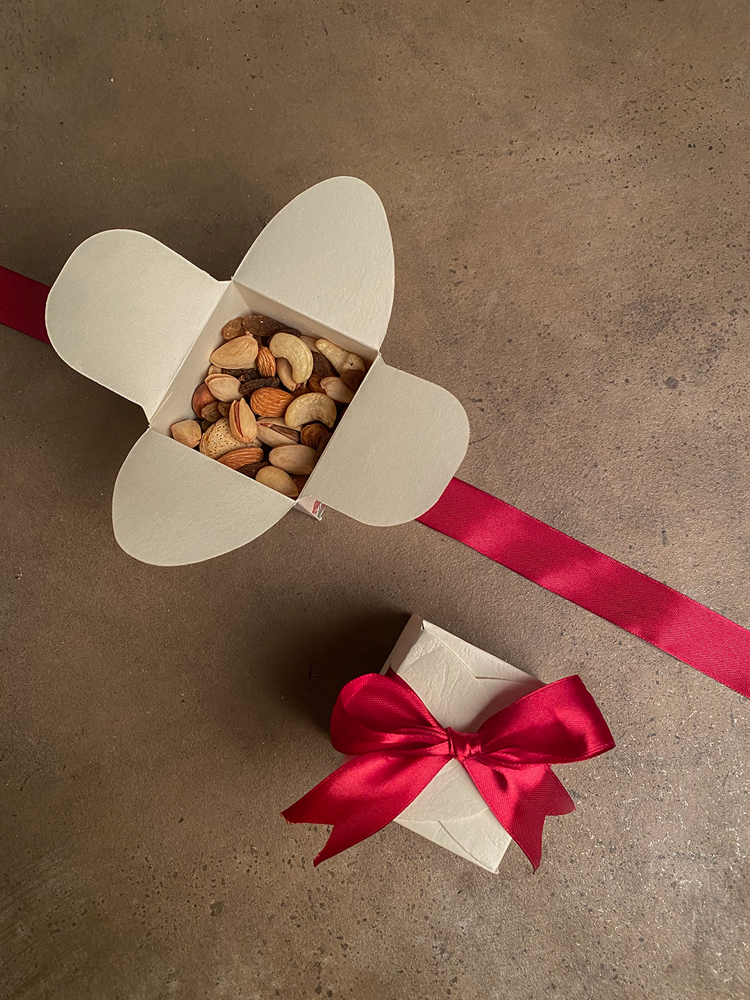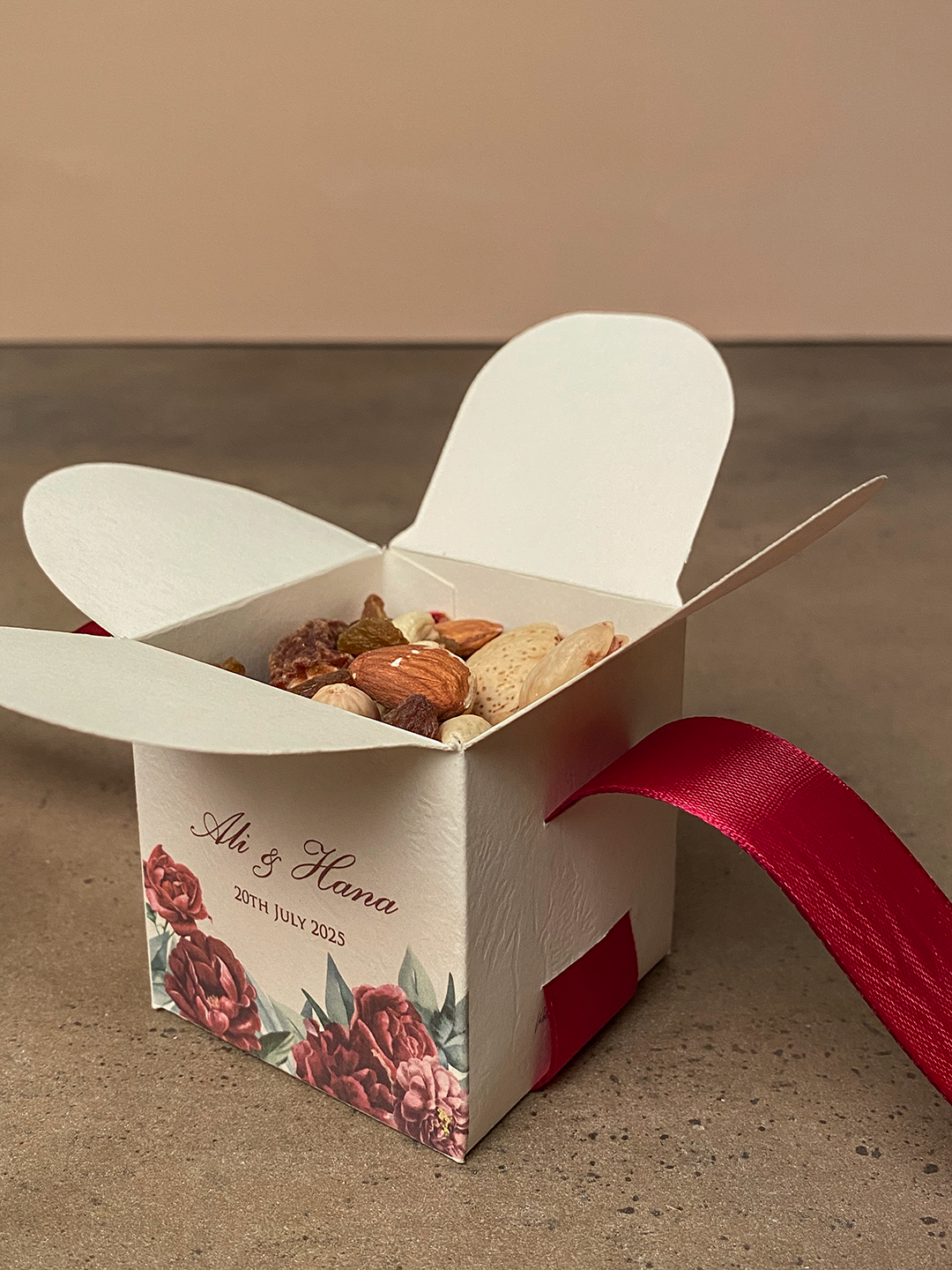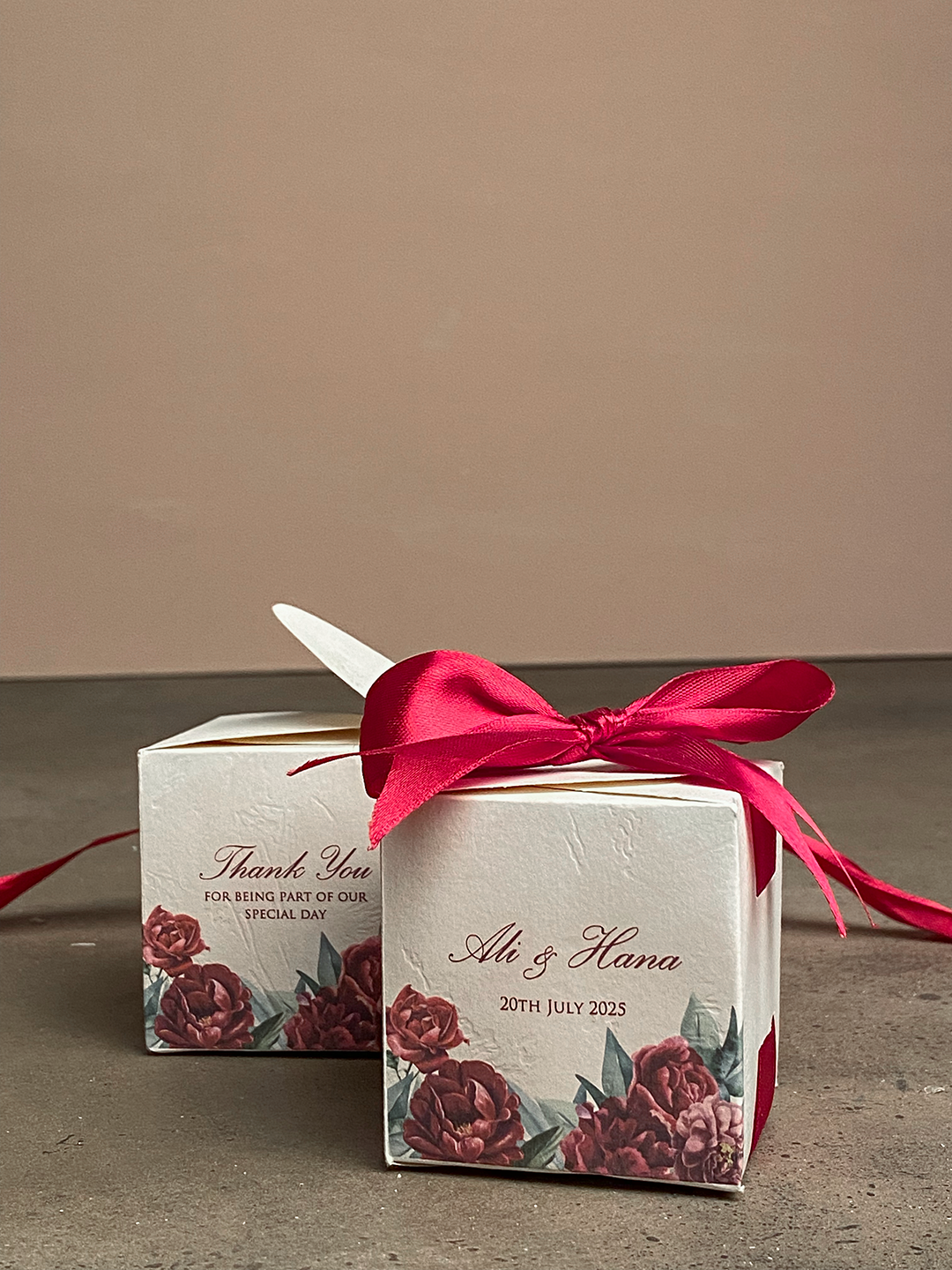 Sized at 2.5 x 2.5 inches, this Buffalo-texture cube box is the sweetest way to give as bidh on your Nikkah or Wedding day. Finished with a satin ribbon and adorned in red and maroon floral details, it brings thoughtfulness to your special occasion.