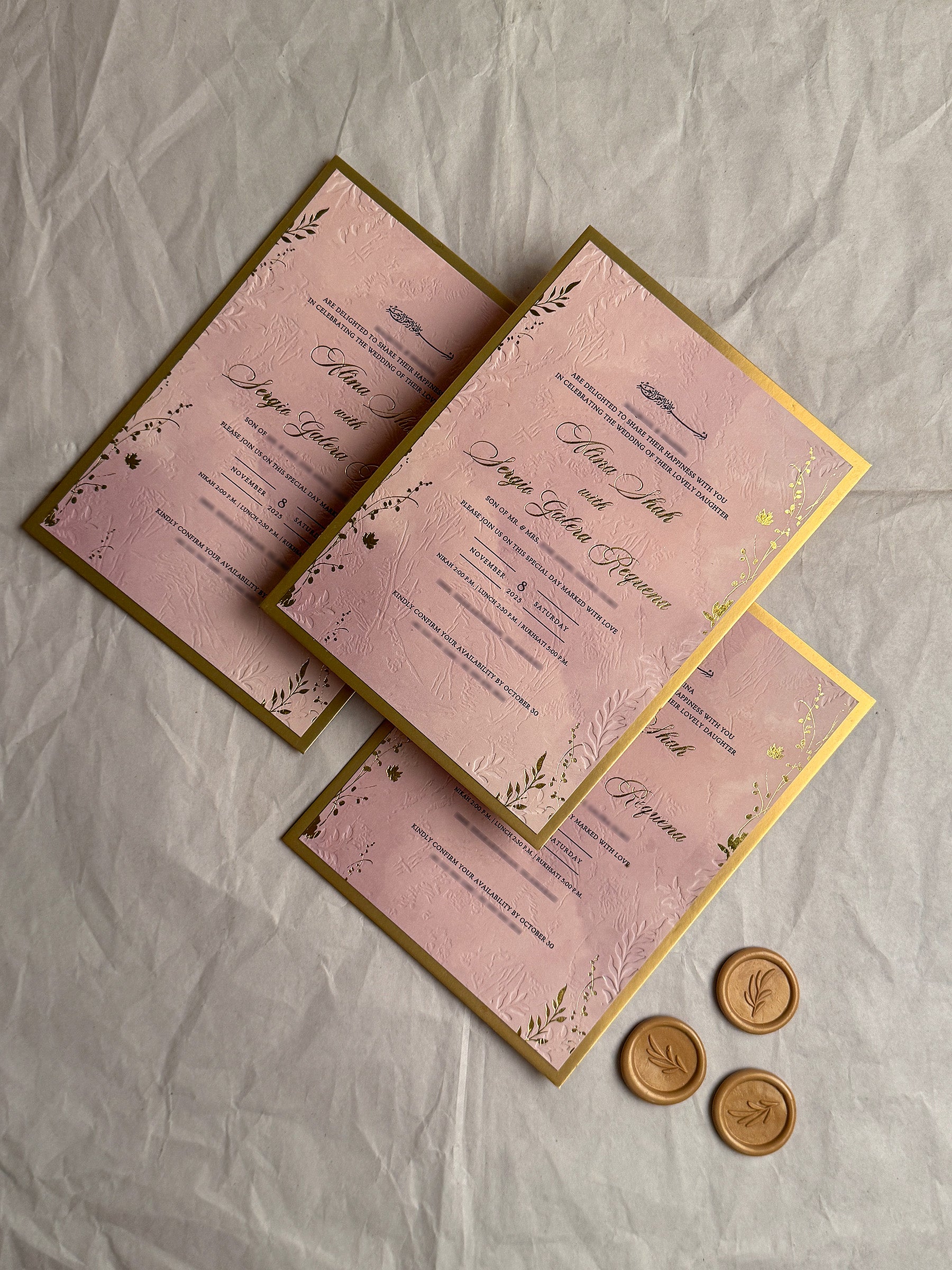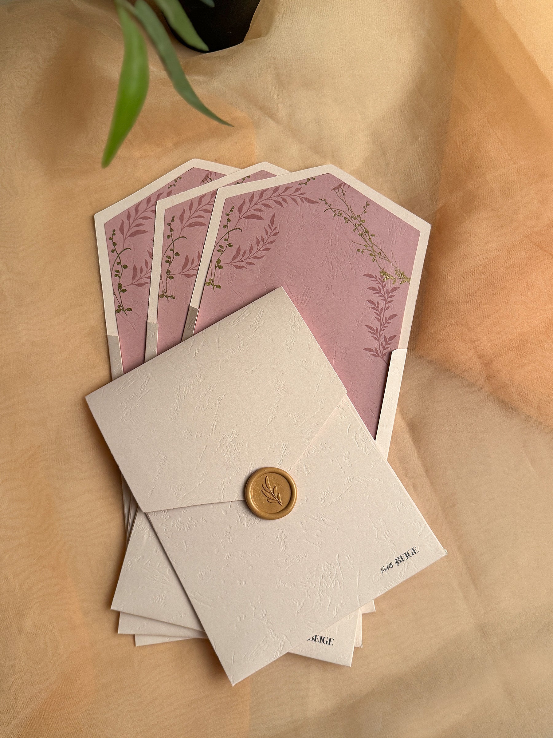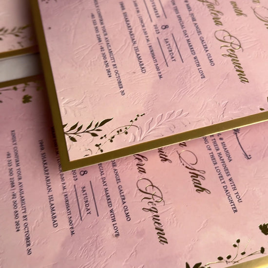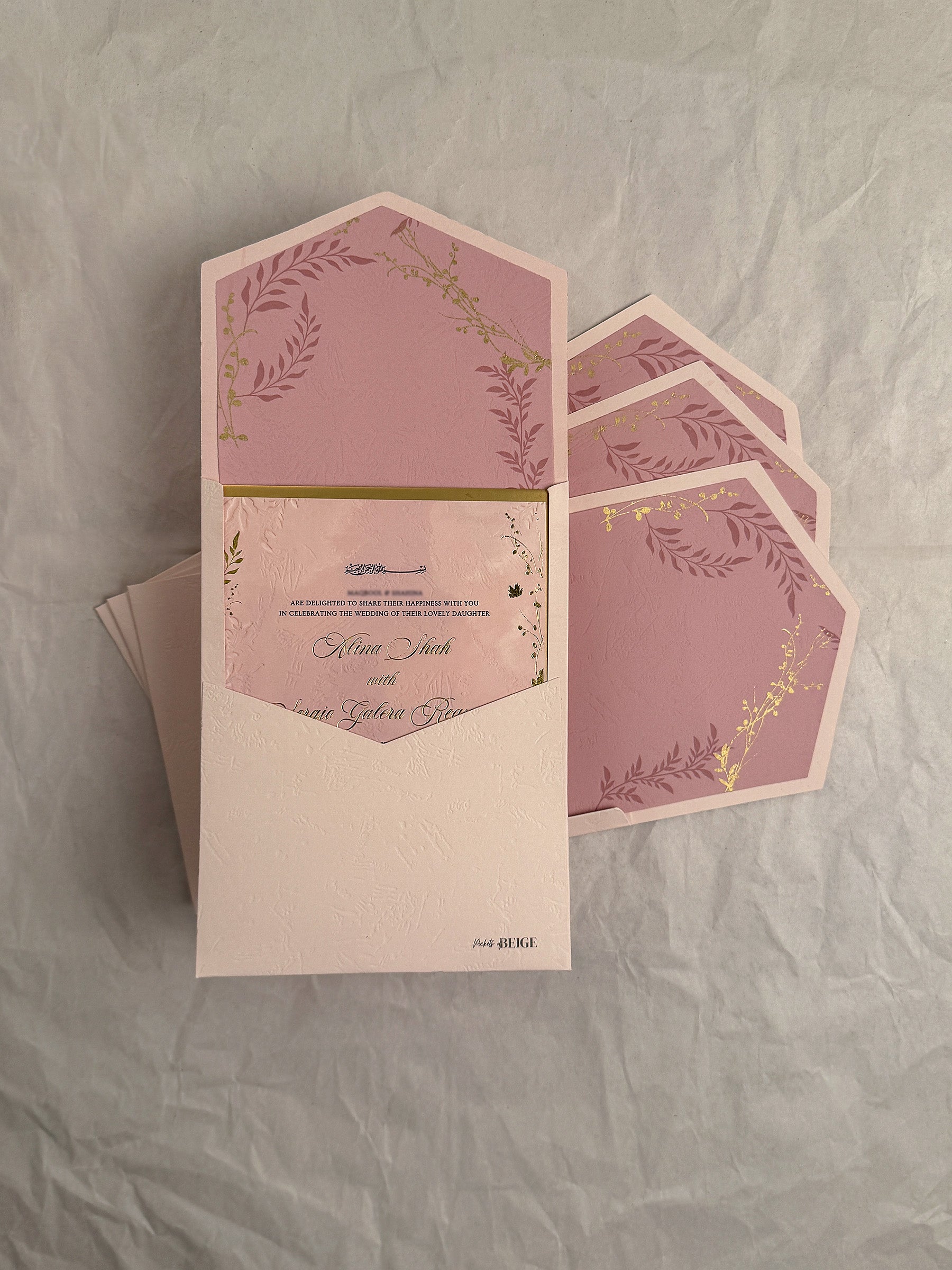 Etched Form is crafted as a modern, design-forward statement piece, sized at 6×8 inches and printed on premium textured card that enhances its structured, elevated feel. The main card features a leafy etched-in border paired with gold-foiled leaf detailing, over a soft pink cloud-wash base that adds depth without visual noise. It is then mounted on a gold card for added structure and a further enhanced golden accent, complemented by the same elements carried into the envelope. The light pastel pink envelope opens to a darker pink inner liner showcasing printed and matte-gold botanical detailing, creating a cohesive, elevated reveal from start to finish.