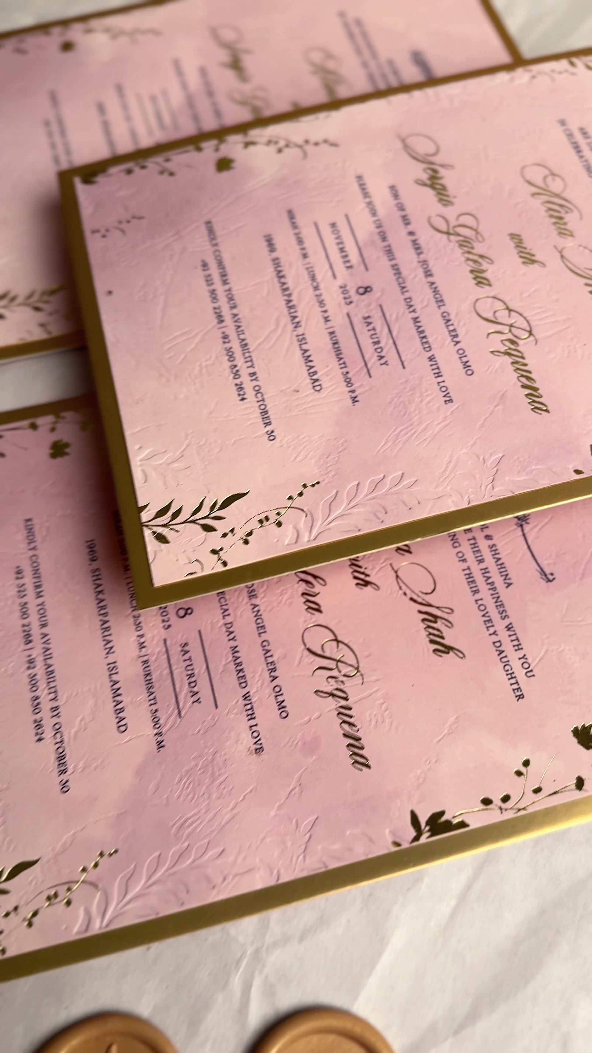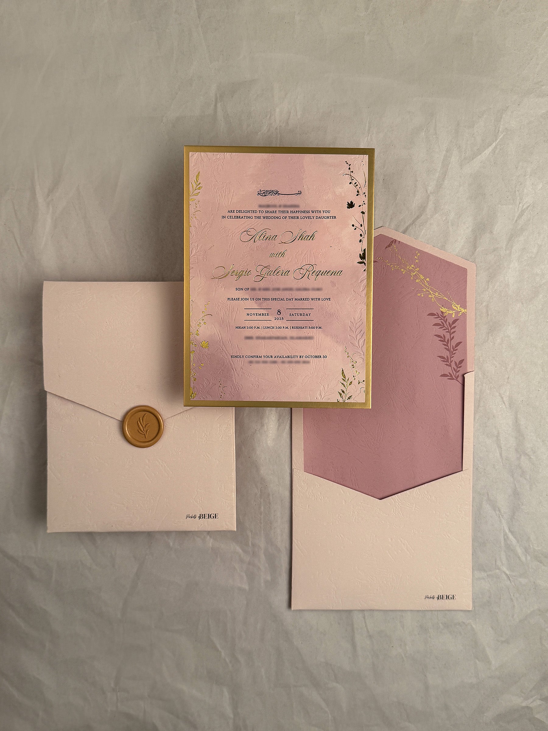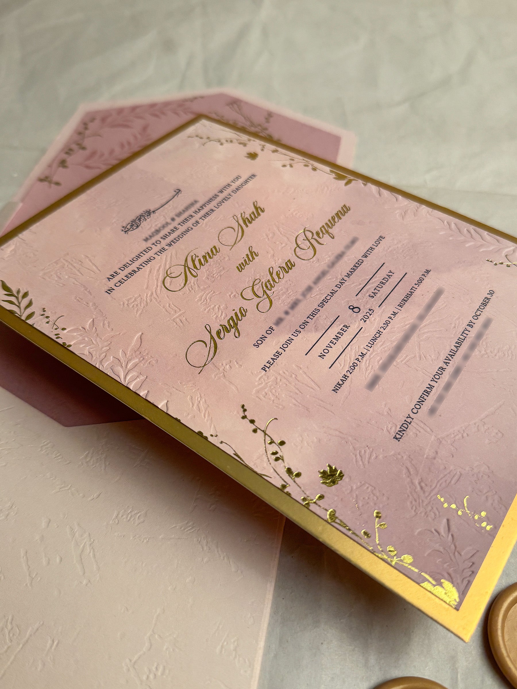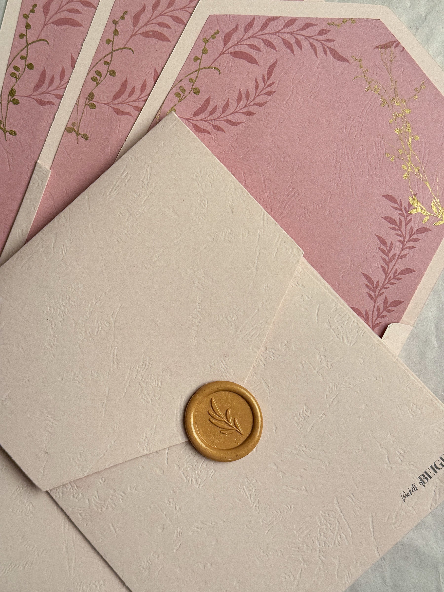 Etched Form is crafted as a modern, design-forward statement piece, sized at 6×8 inches and printed on premium textured card that enhances its structured, elevated feel. The main card features a leafy etched-in border paired with gold-foiled leaf detailing, over a soft pink cloud-wash base that adds depth without visual noise. It is then mounted on a gold card for added structure and a further enhanced golden accent, complemented by the same elements carried into the envelope. The light pastel pink envelope opens to a darker pink inner liner showcasing printed and matte-gold botanical detailing, creating a cohesive, elevated reveal from start to finish.