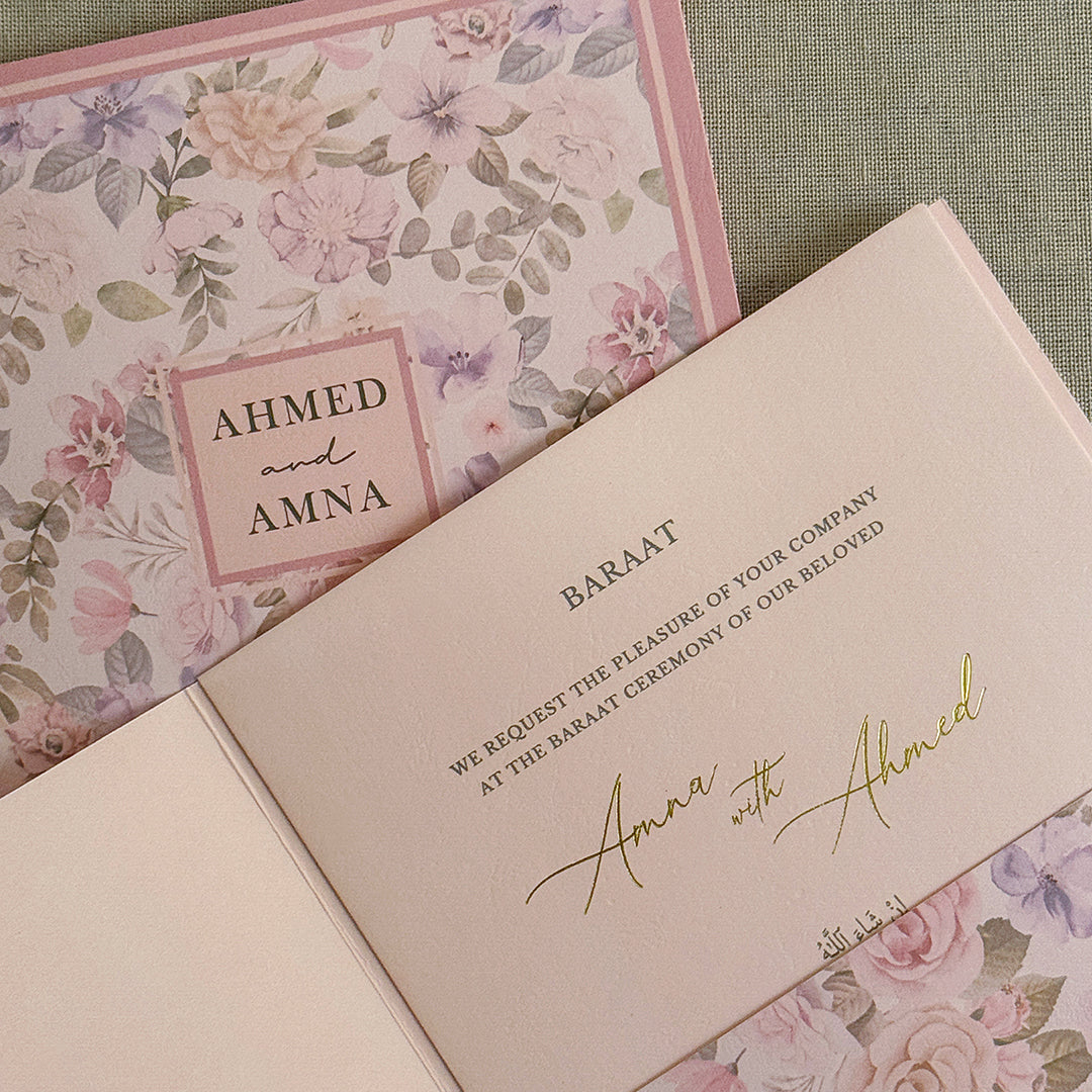 Inside, a built-in pocket holds up to three inserts. Each insert features the couple’s names in gold foil, bringing a subtle warmth to the ensemble. The completed suite slides into a square-flap envelope, forming a cohesive, contemporary presentation.