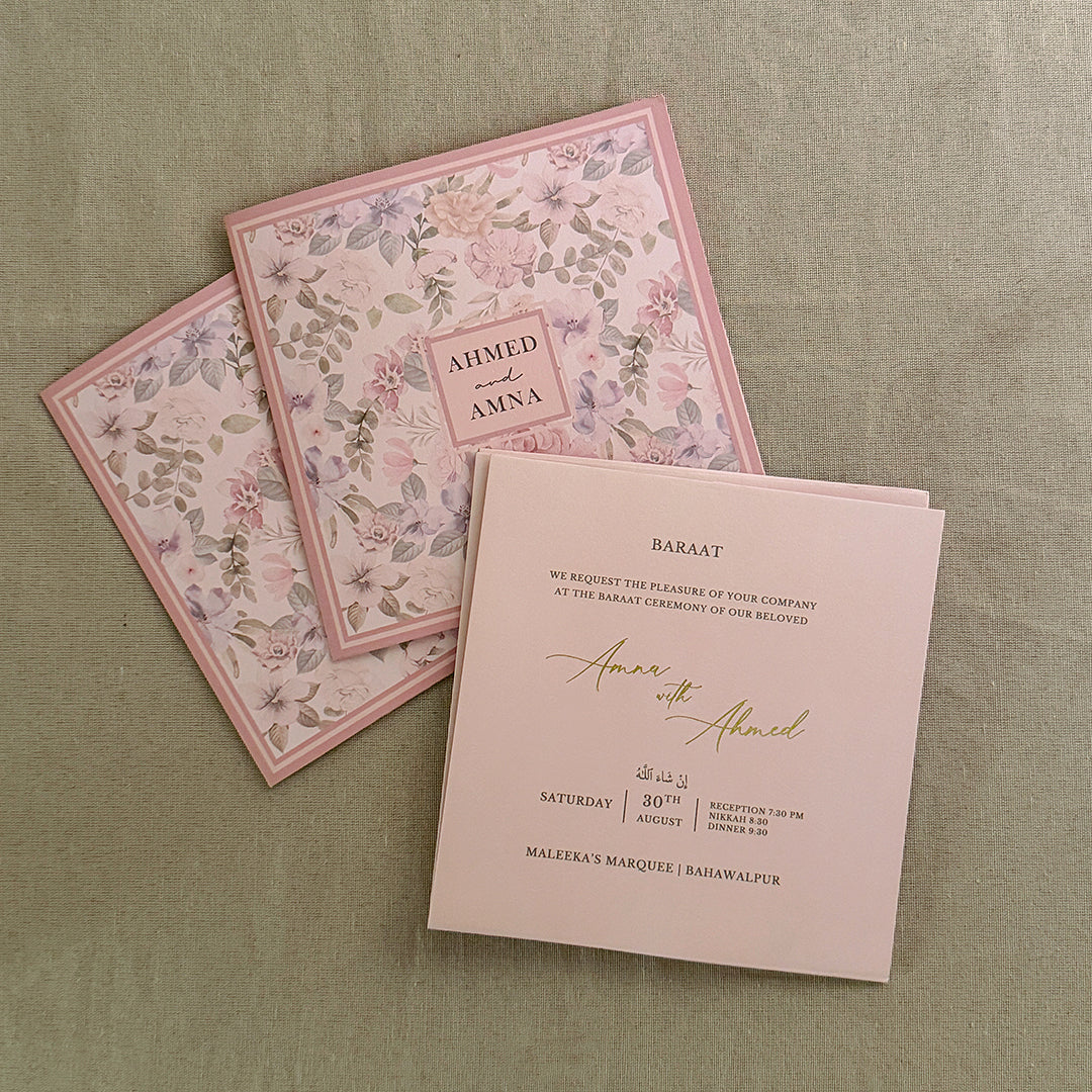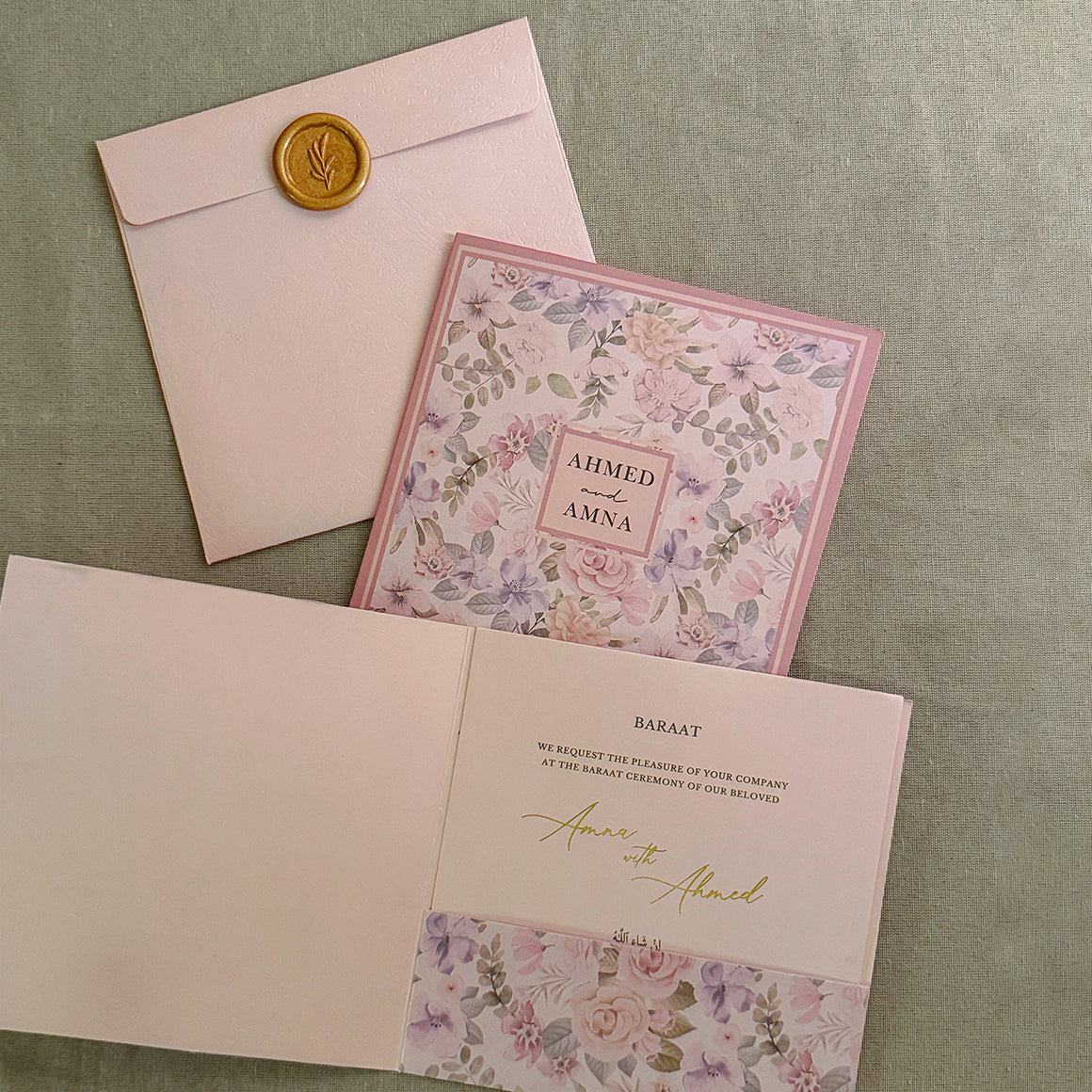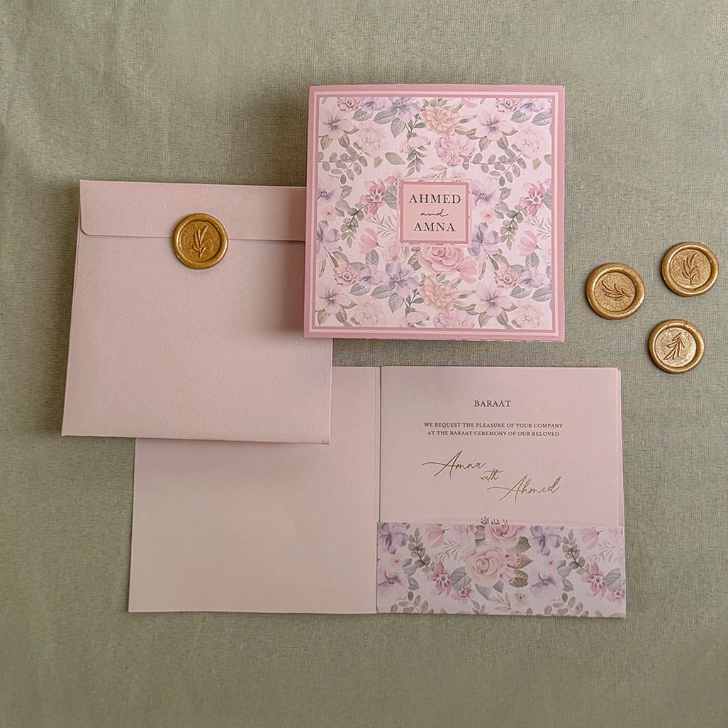 Sized at 6x6 inches, the Rosey Dust invitation is crafted on buffalo-texture cardstock, lending each piece a sense of luxury. The jacket showcases a seamless floral pattern, gently faded over a pink base, a nod to time-worn botanical art.