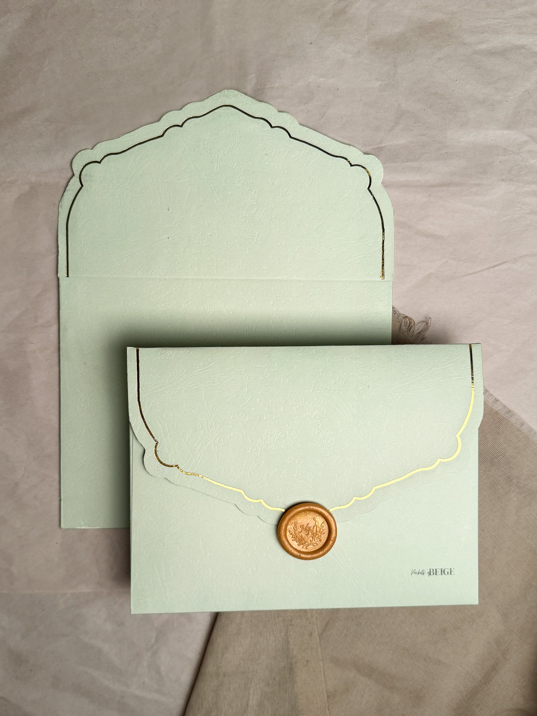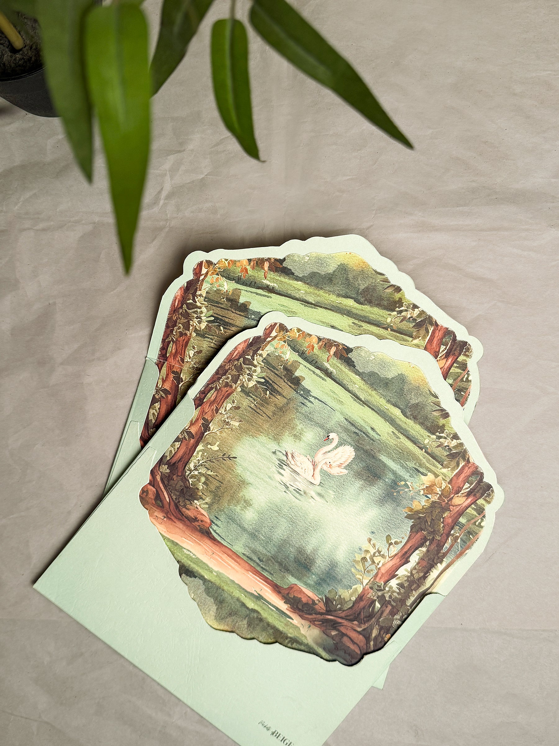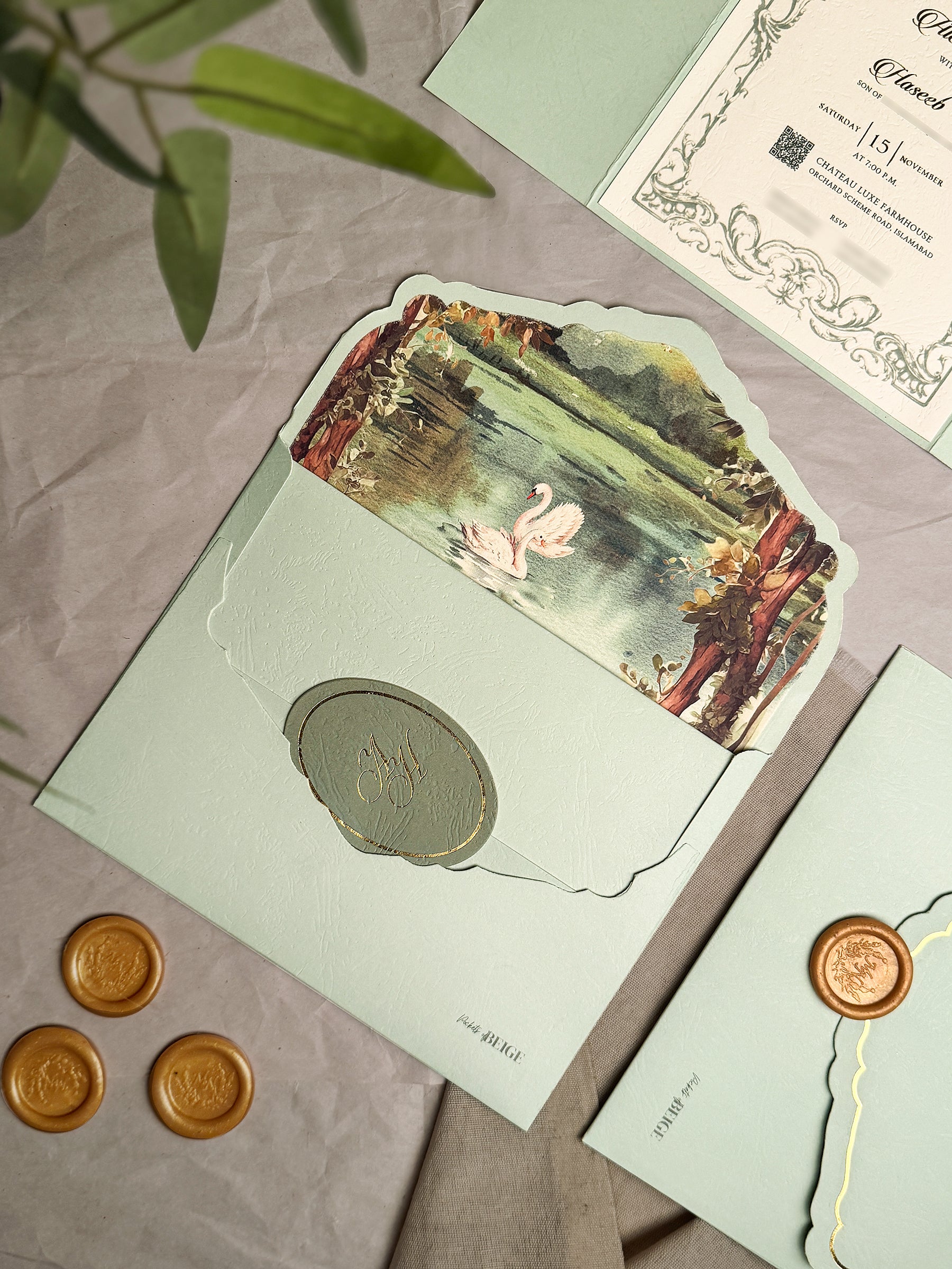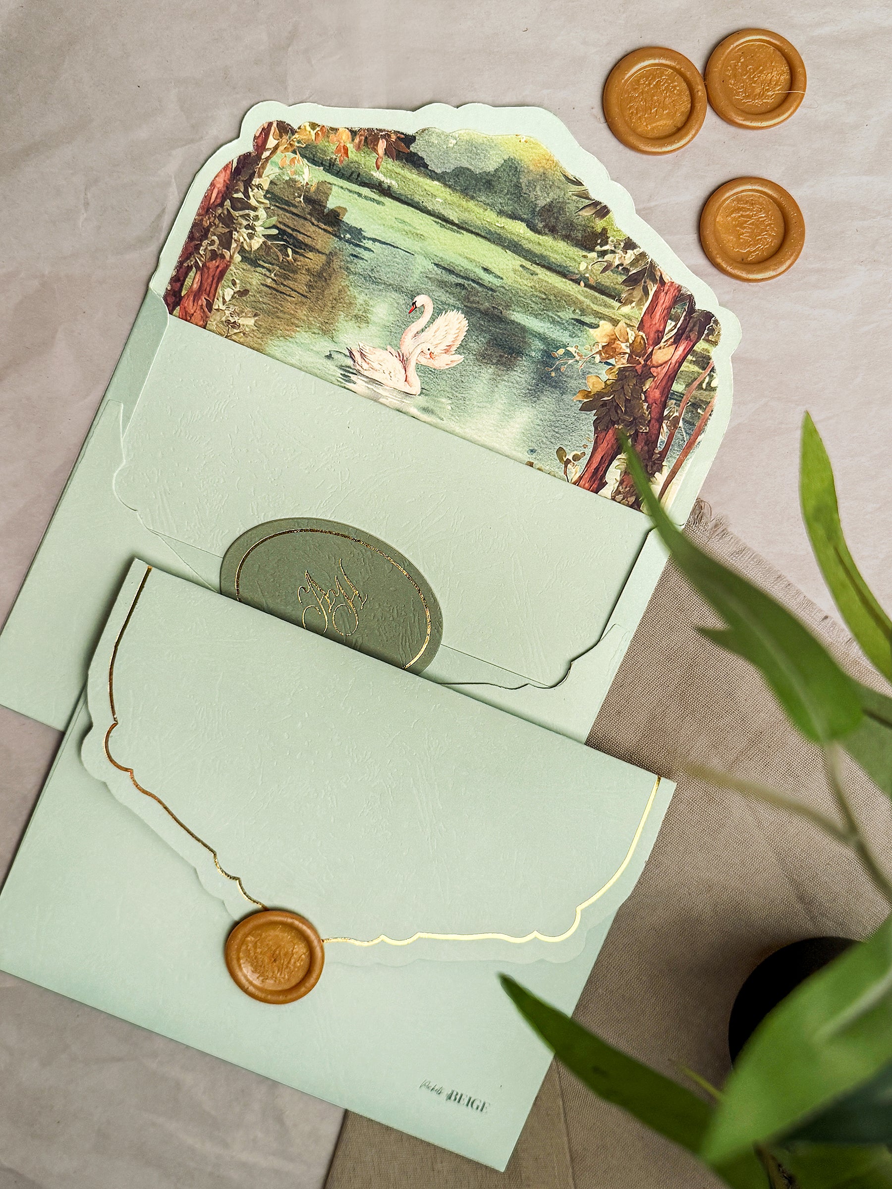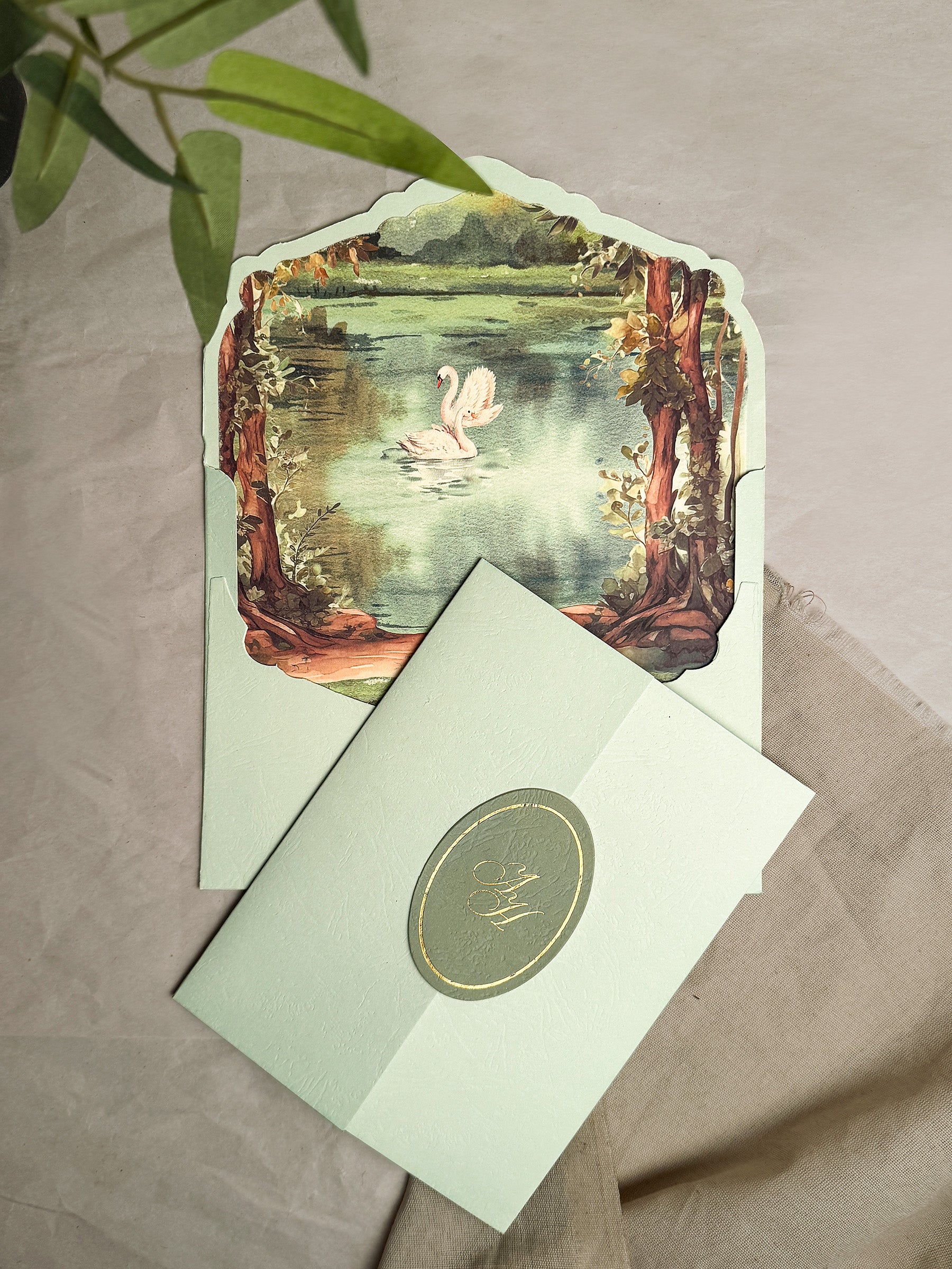The light green scalloped envelope is lined with an illustrated swan and lake scene and finished with gold foiling that traces the shape of the flap, completing the suite with a structured finish.