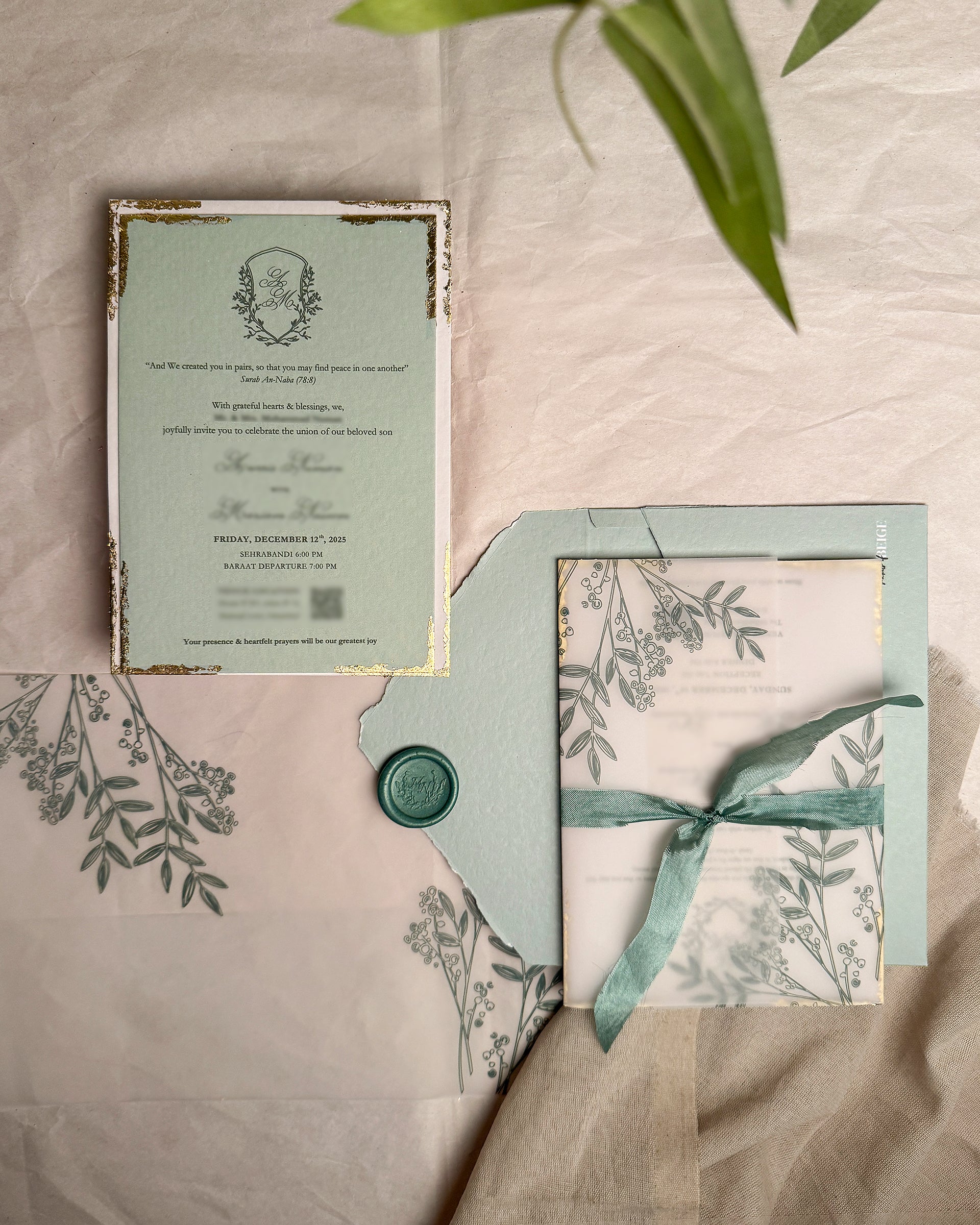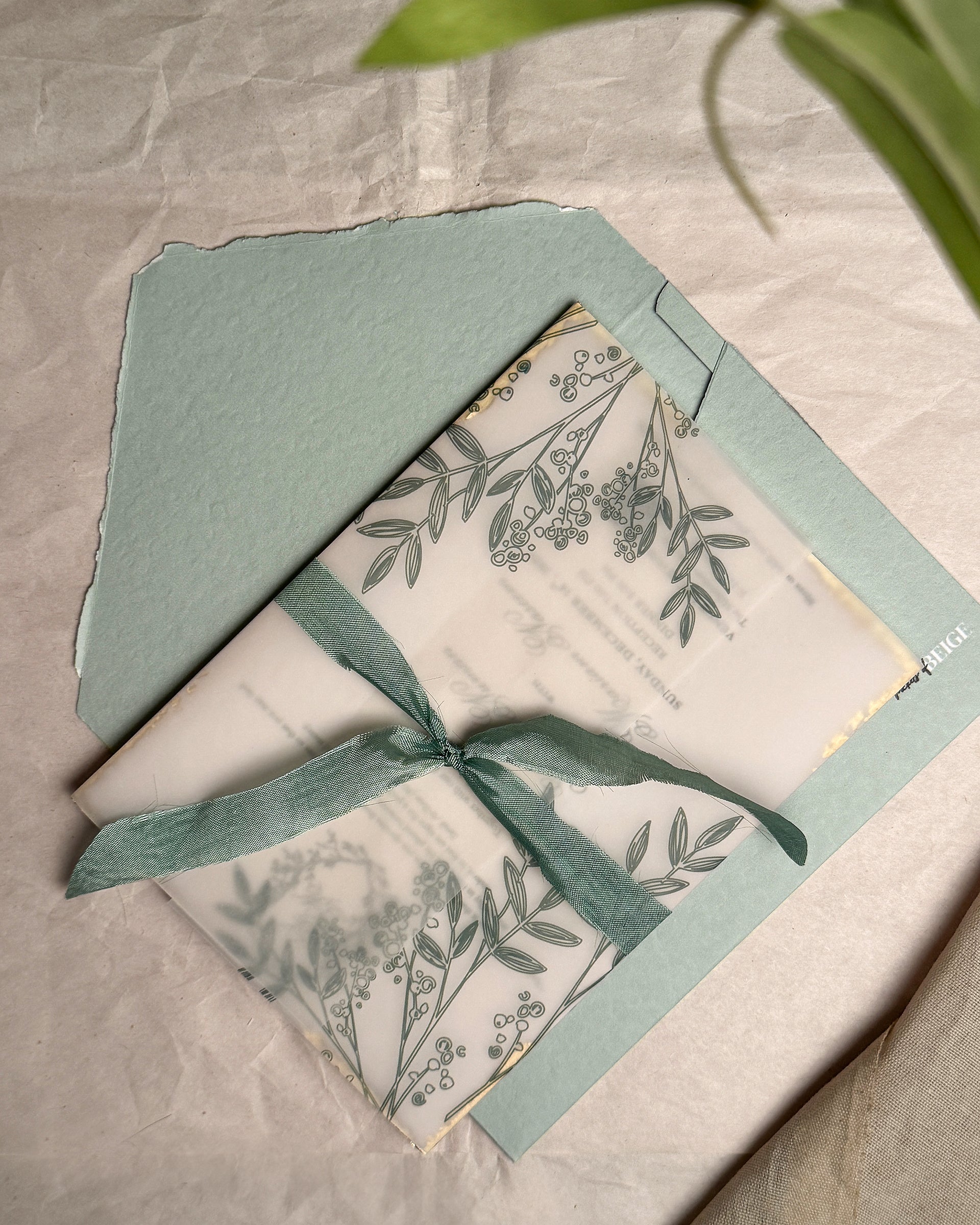 The vellum is printed with delicate botanical line art in a soft neutral tone. A frayed silk ribbon in a coordinating shade is available as an optional add-on. The envelope is made from matching raw textured card and finished with a deckled-edge flap, completing the set with a clean, cohesive finish.