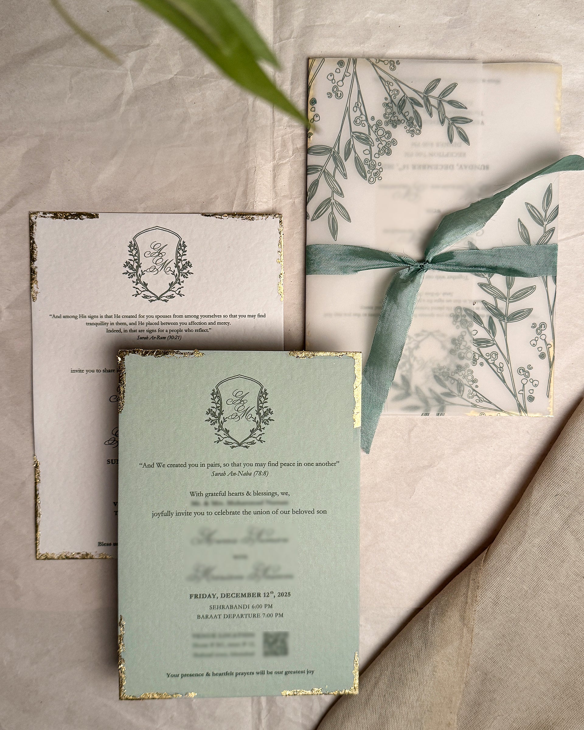 This invitation suite is sized at 5.5×7.5 inches and crafted from raw textured card. Each piece is double pasted and finished with soft gold leafing along the edges. The design is minimal, featuring a central crest with initials. The suite allows for up to three inserts, created in complementary neutral and muted tones to maintain a refined, understated look.