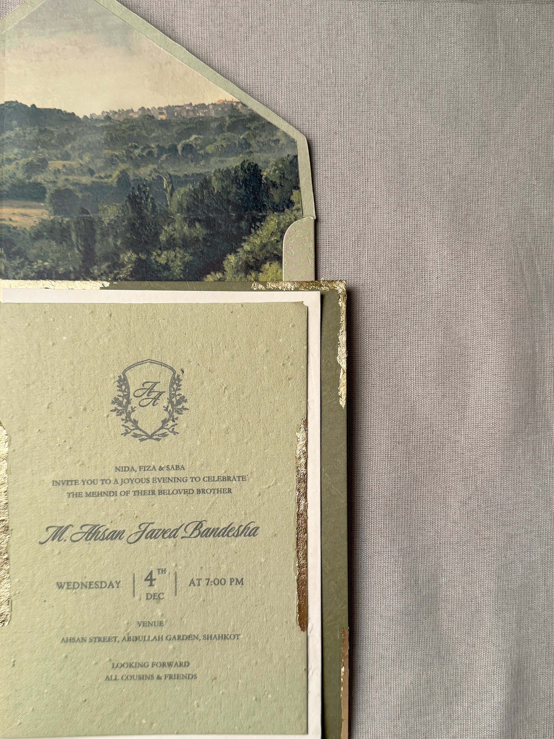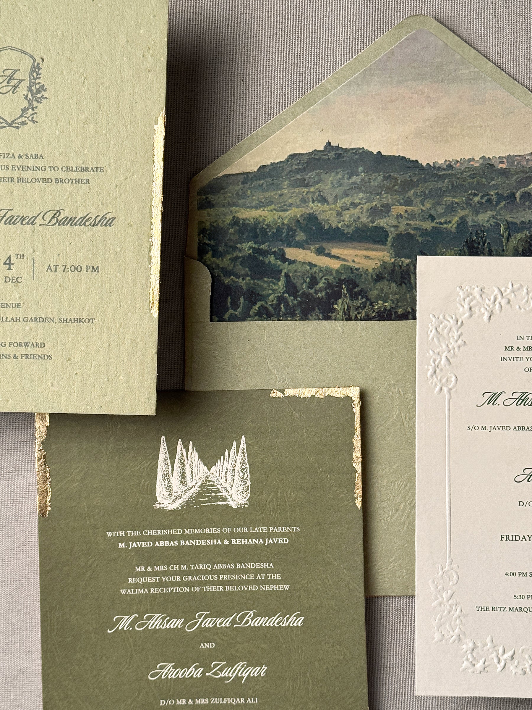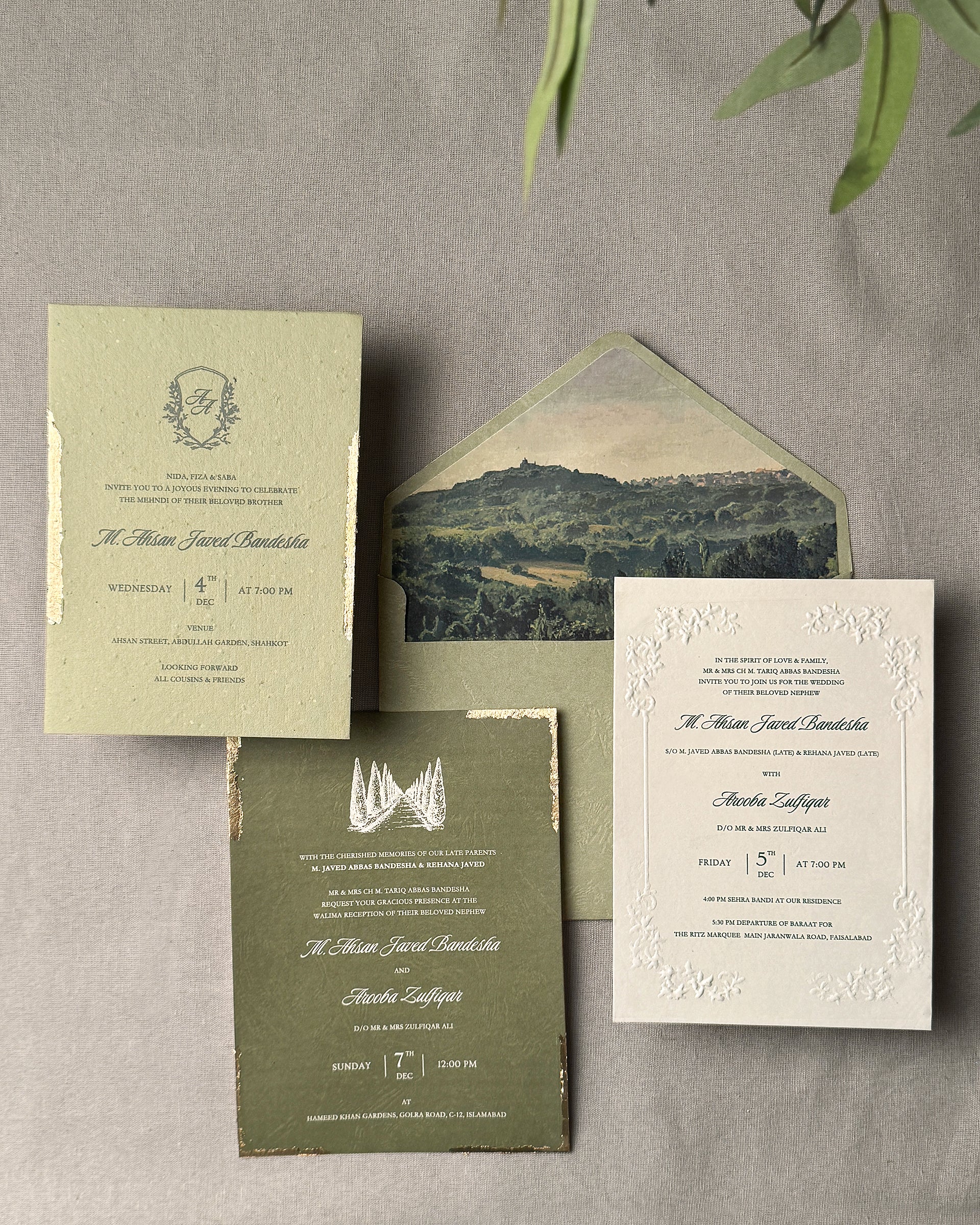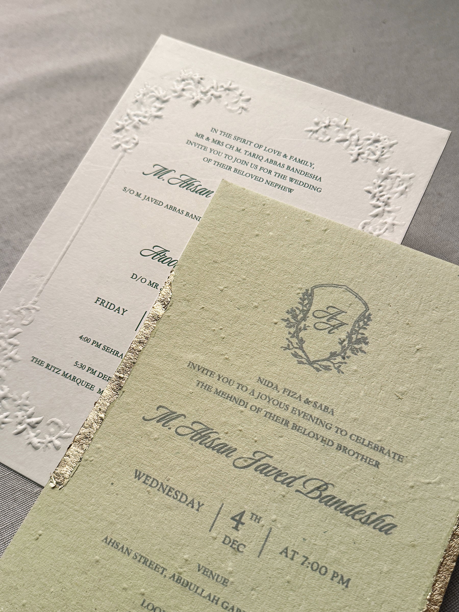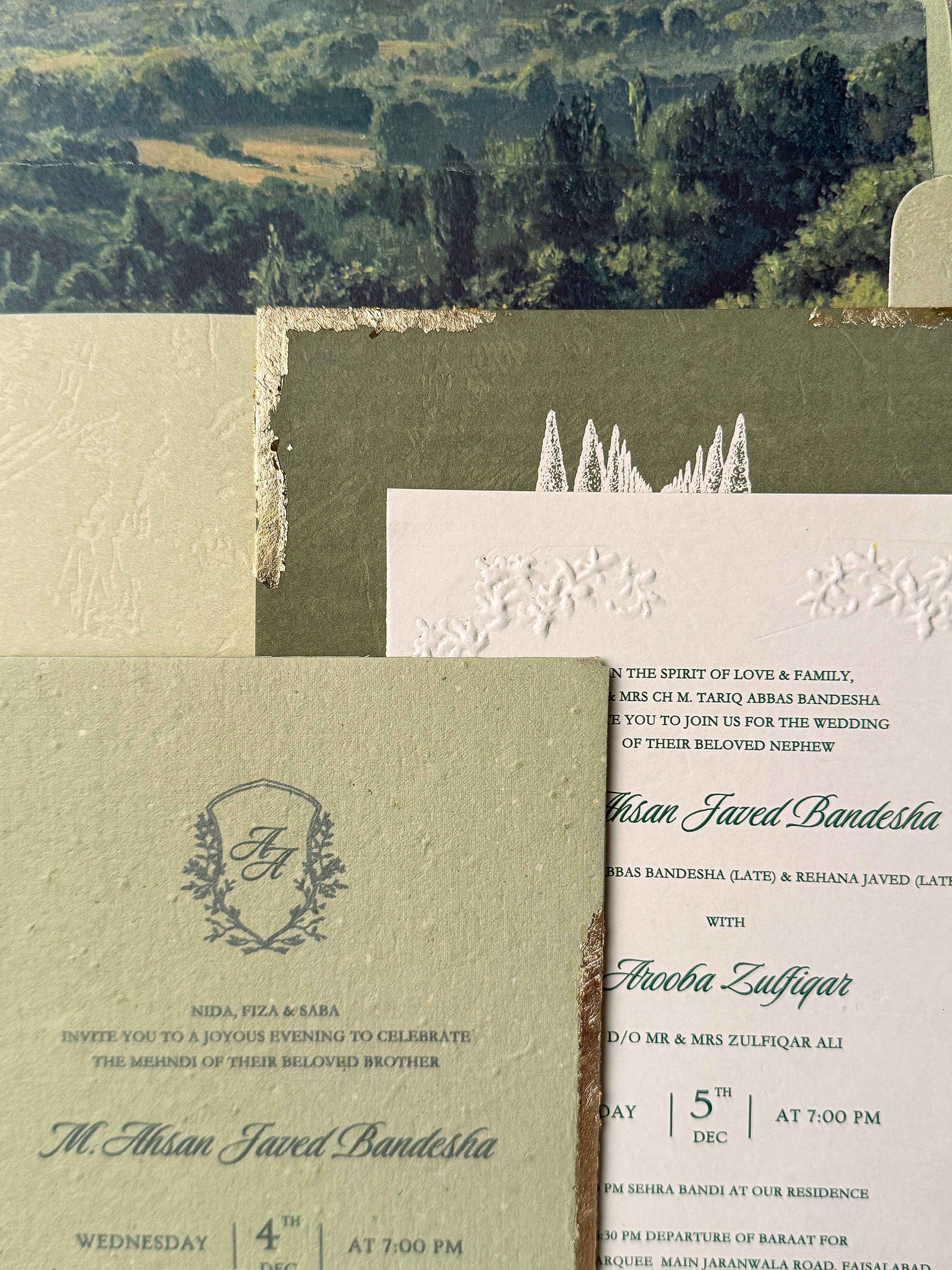The main insert is of a dark green colour with gold leafed edges, the second one features a blind-embossed border with subtle leafy detailing, adding depth and the third insert is made out of seed paper, that too, finished with hand-applied gold leafing along the edges.