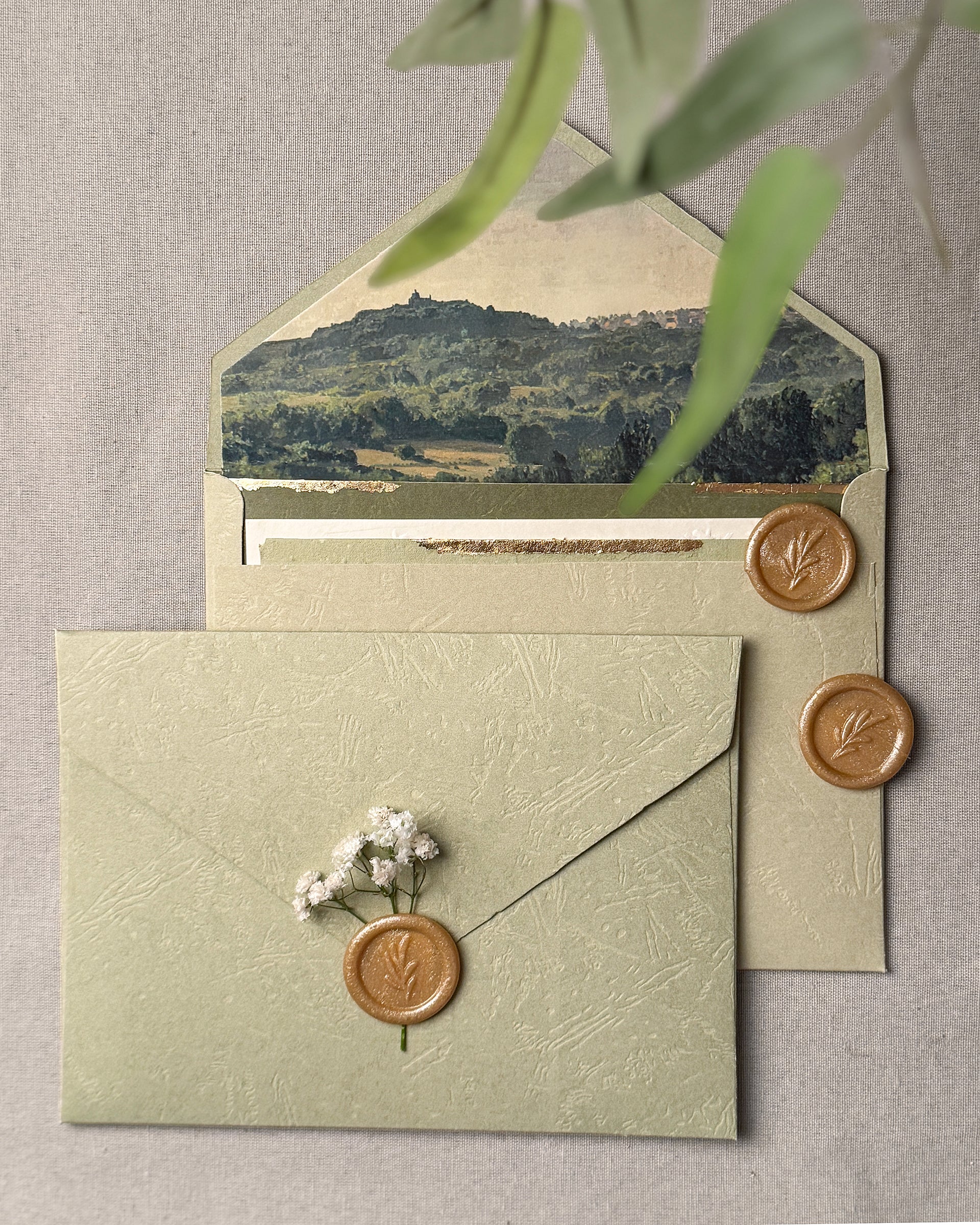 Sized at 6×8 inches, Vista brings together buffalo-textured stock, plain card and seed paper in a restrained, material-led composition. The design draws from natural surroundings, with a green hilly landscape lining the envelope and tonal greens carried through the suite.