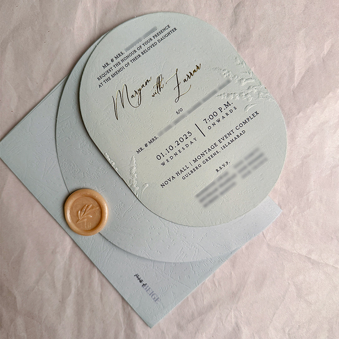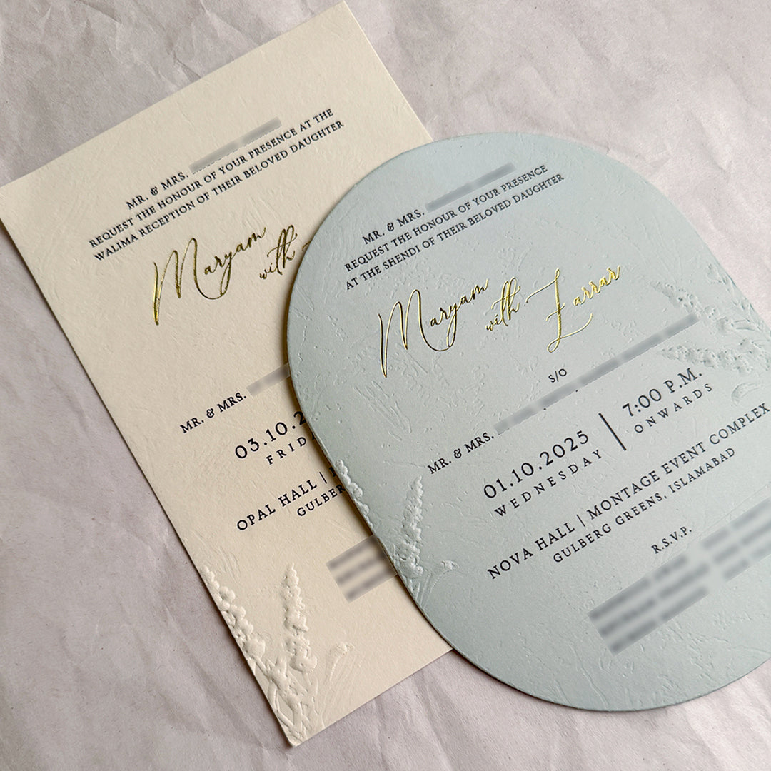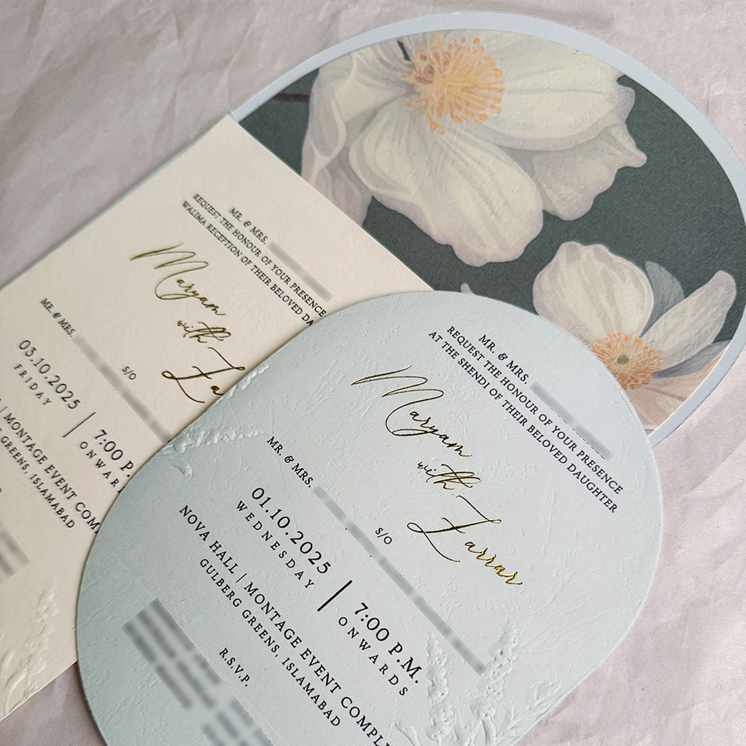 Transform your wedding announcement into a keepsake with the Windflower's Promise. Sized at 5x7 inches, this invite is made entirely from buffalo texture card. The suite allows up to three inserts, each in a different shape, circular, oval and arch, creating an artistic layered effect. The couple’s names gleam in gold foil on every insert, set against a backdrop of subtle blind-embossed floral details.