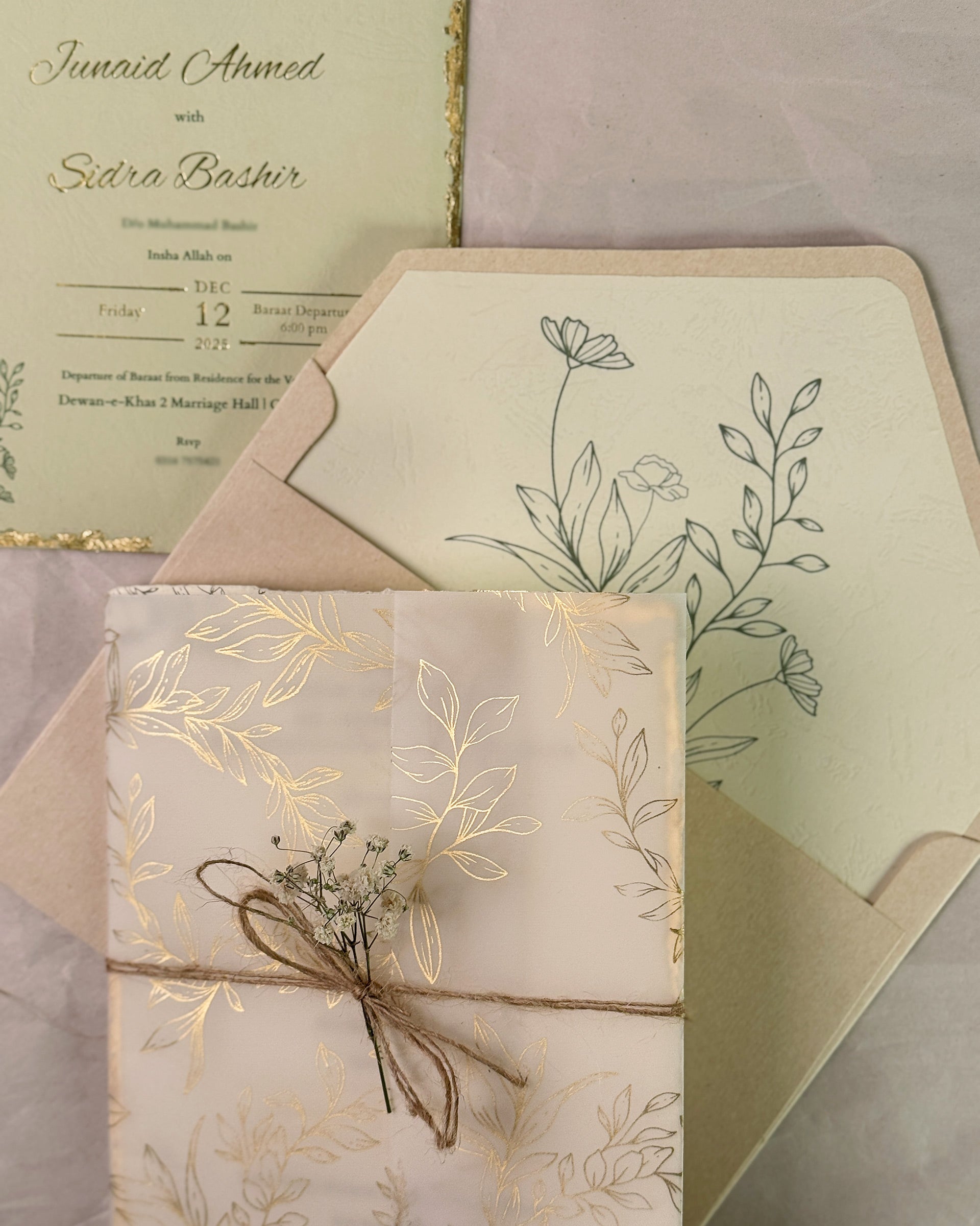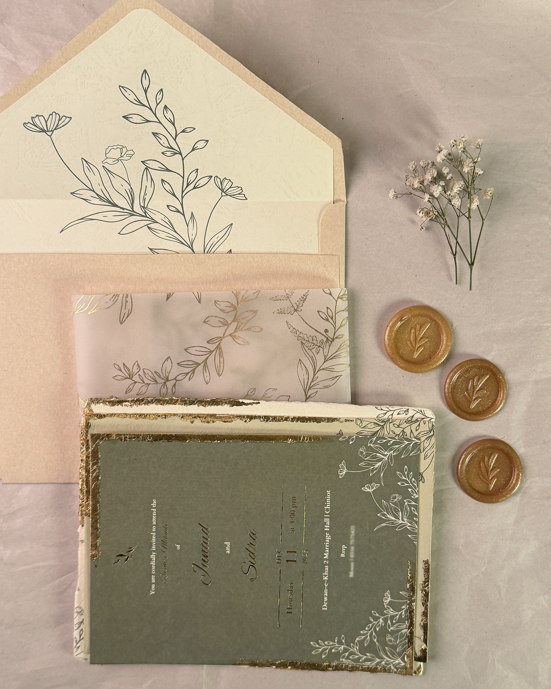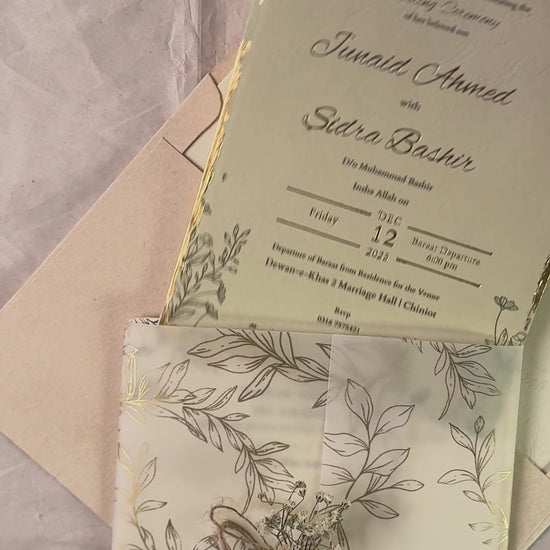 Tuscany is a product exuding the essence of the Tuscan sun. Off-white and sage green are the perfect colours to capture a sense of nostalgia - the 6x8 inch buffalo texture card allows for a vintage touch with the smaller insert being deckle edged. Names and dates are further elevated with gold-foiled details, while inserts encased in a vellum sheet are fastened with a jute rope and baby's breath. This whole package then sits snug in the tag card envelope with a liner of sage green floral line art design, humble yet ornate, sealed with a wax seal stamp to complete the ensemble. All inserts come with gold leafing.