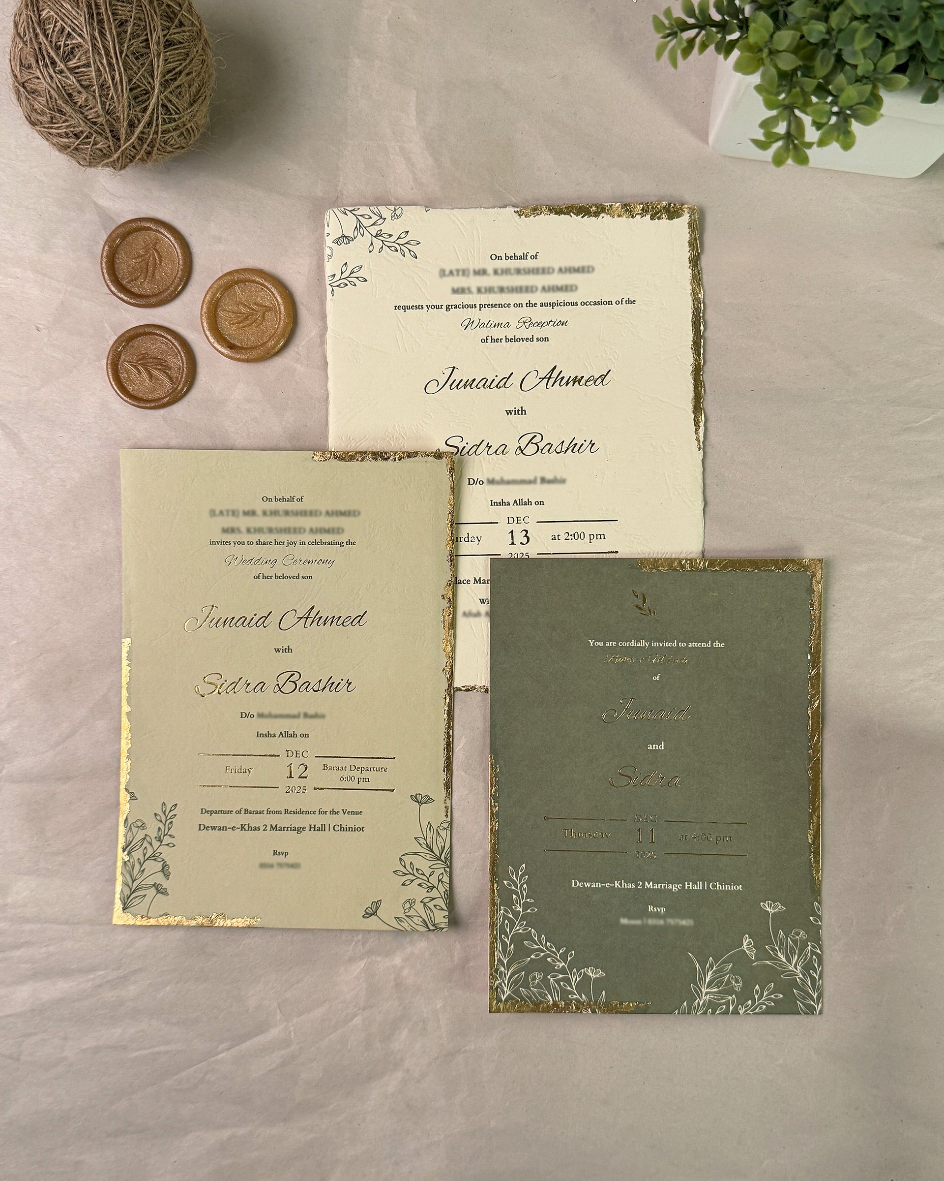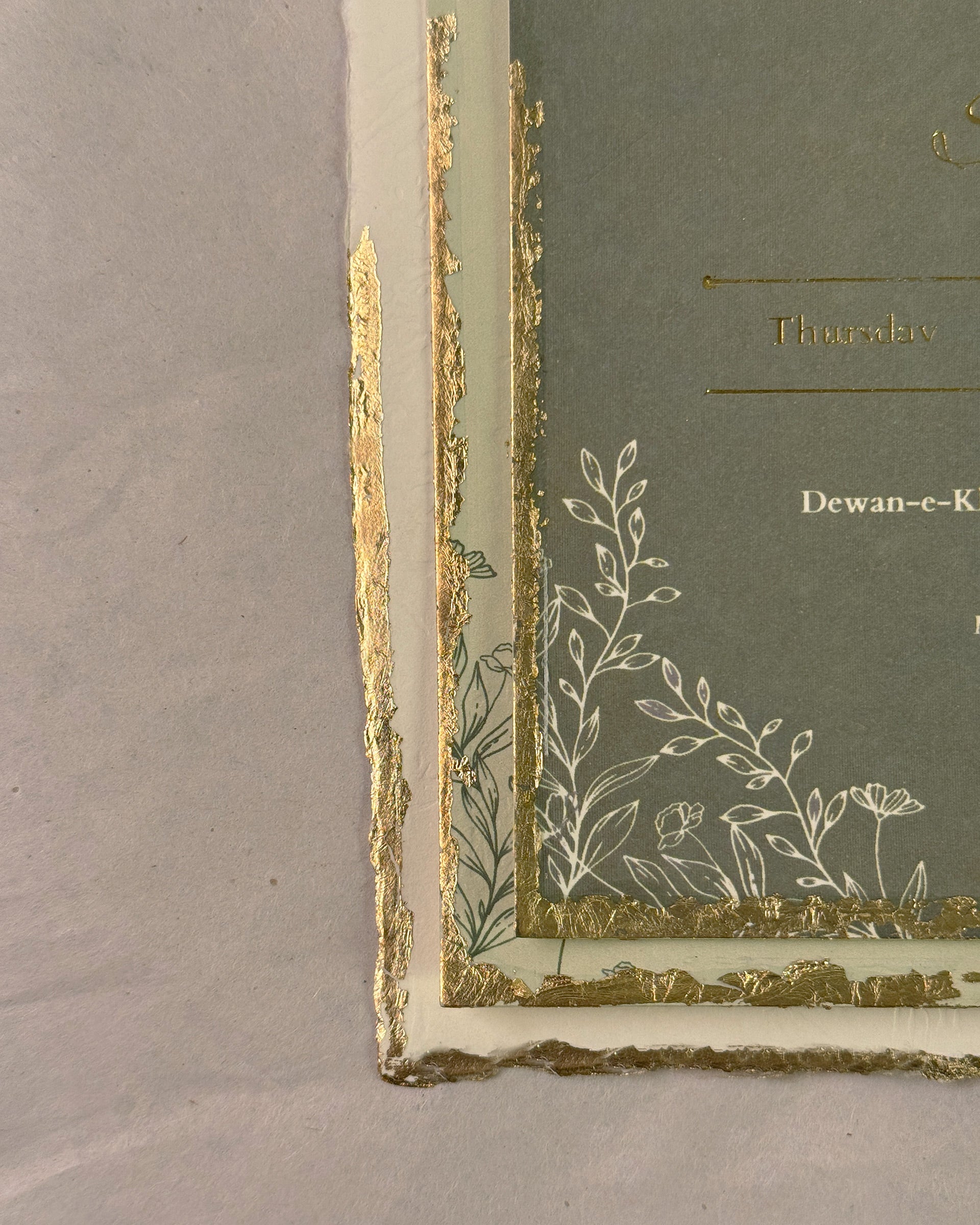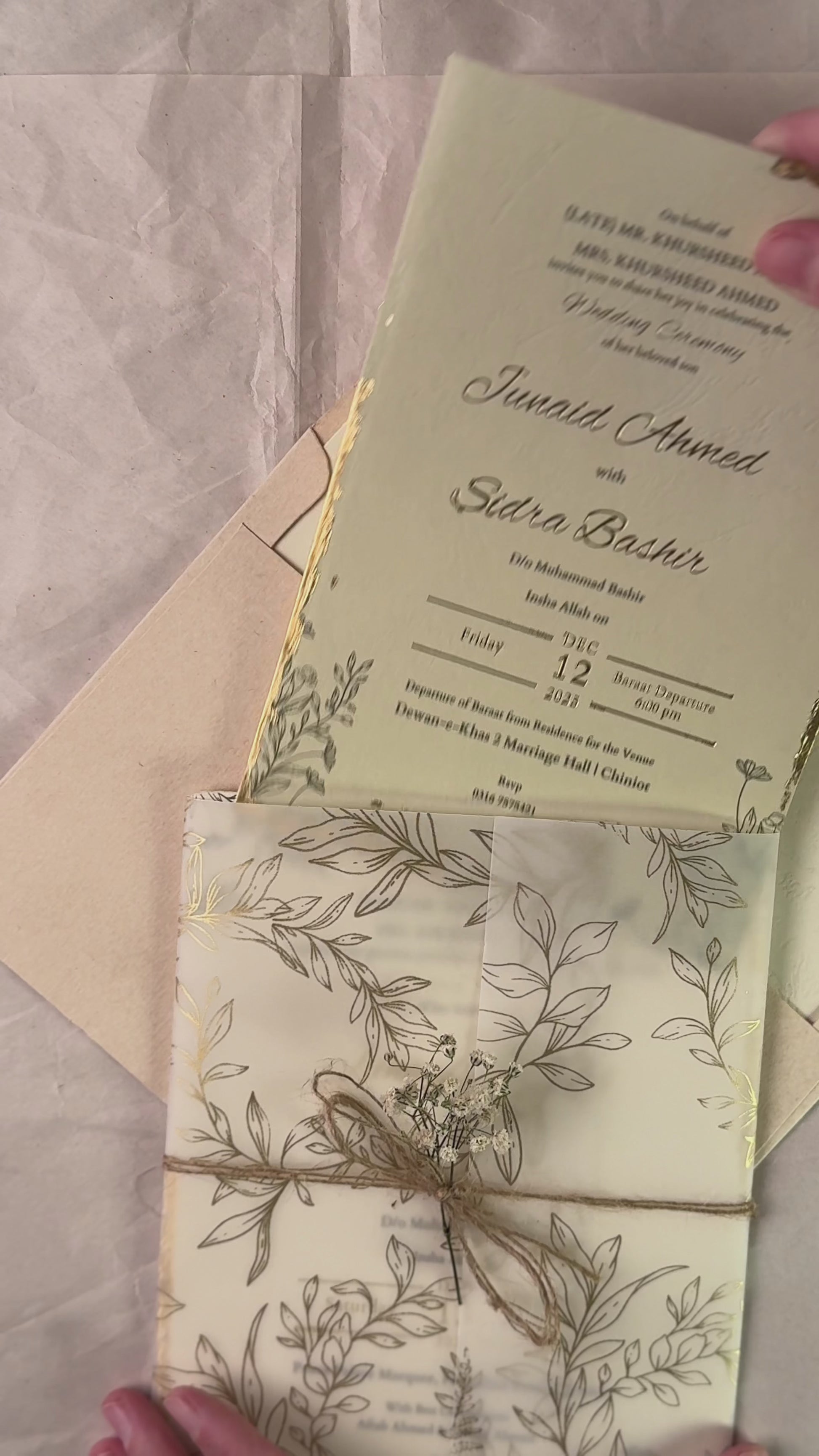 Tuscany is a product exuding the essence of the Tuscan sun. Off-white and sage green are the perfect colours to capture a sense of nostalgia - the 6x8 inch buffalo texture card allows for a vintage touch with the smaller insert being deckle edged. Names and dates are further elevated with gold-foiled details, while inserts encased in a vellum sheet are fastened with a jute rope and baby's breath. This whole package then sits snug in the tag card envelope with a liner of sage green floral line art design, humble yet ornate, sealed with a wax seal stamp to complete the ensemble. All inserts come with gold leafing.